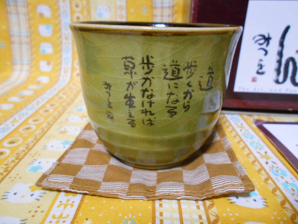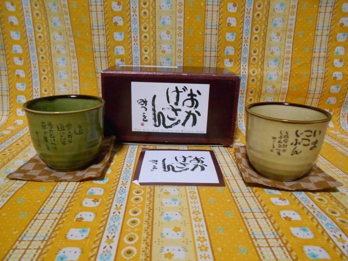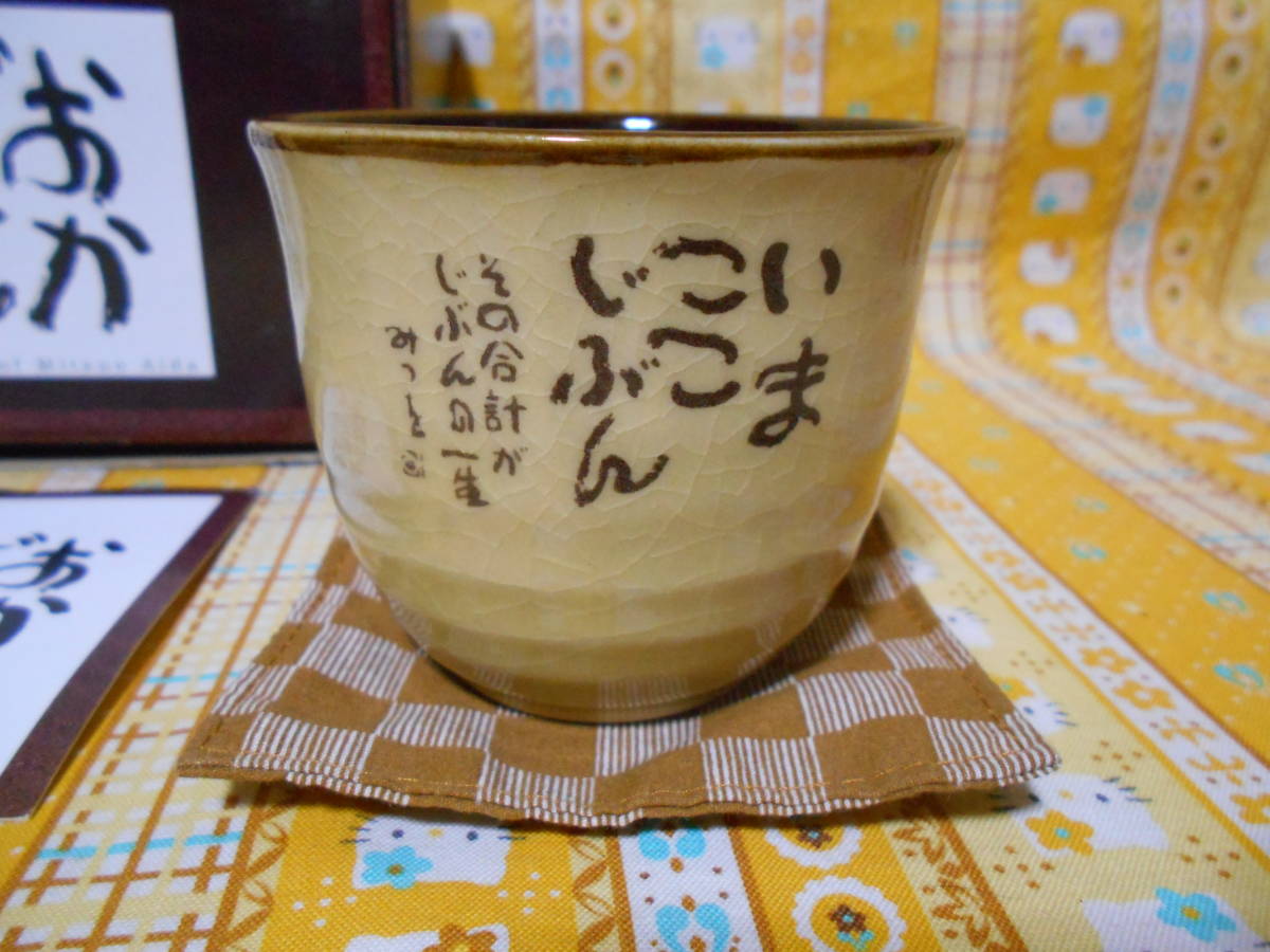 ♪相田みつを新品箱入り陶器製布製コースター&湯呑み色違いセット「道」&「いまここじぶん」