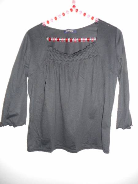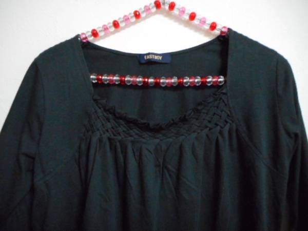 | ブランド・形態】 EAST BOY イーストボーイ です。 【カラー】 黒色です。 実物は表示タグが写っている写真が近く黒色です。 掲載の実物写真はPC環境や光の加減により実物と色合いが若干異なる場合があります。 【特徴】 スクエアネックの胸元は同生地を編んだようなデザインで、すぐ下はギャザーです。七分袖シンプルなTシャツカットソーです。(写真参照) 実物は表示タグが写っている写真が近く黒です。 【状態】 少々使用感はございますが、特に目立つダメージは見受けられず、着用に問題無いと思われます。 お洗濯による毛羽立ち、素材によるこすれ程度はあります。 【素材】 ポリエステル65%です。 コットン35%です。 【記載サイズ】 サイズは11となっておりますが実寸も参考にして下さい。 【実寸サイズ】{平置き採寸} 縮みや伸びが生じている場合がありますので実寸サイズをご参照ください。 着丈 : 約53cm (背面襟下から裾まで) 肩幅 : 約35cm (両肩を直線で結んだ線) 身幅 : 約46cm (両脇を直線で結んだ線) 袖丈 : 約40cm (肩縫い目から袖先まで ) 尚、素人採寸です多少の誤差はご了承下さい。 裄丈 : 約‐‐‐cm (後衿ぐり中央から肩先までを水平に計った長さと、 肩先から袖口までを足した値 ) | |||