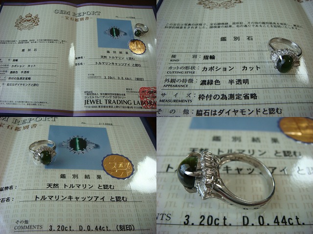 | ご覧頂きましてありがとうございます! とても珍しいトルマリンキャッツアイの指輪です。サイズは約13です。プラチナ製です。 トルマリンキャッツは3,20カラットです。ダイヤは0,44カラットです。 鑑別書付き。重さは約8,3gです。新品仕上げ済み。新品のケースに入れてお届けいたします。 追加画像がありますのでパソコンでご確認ください。 宝石との出会いは一期一会です。『いいな』と思ったら是非、身につけてあげて下さい。きっと宝石も喜ぶことでしょう! 宝石は決して貴女を裏切りません。身につけた貴女を守ってくれることでしょう。 いつも頑張っている自分へのご褒美にいかがでしょうか? 良いものをひとつお持ち下さい。一生物のジュエリーとなります。 画像での判断は難しいと思いますが、落札後の返品、クレーム等の無きよう、ご自分の自己責任においてご入札下さい。 モニター、パソコン、カメラによって色や感じ方が変わりますのでご注意下さい。 商品についてはコレクター、質屋さん、お客様の委託品が中心ですので、ご質問の答えが遅くなる事がありますがご了承下さい。 商品説明につきましてはすべてをお知らせできませんので、質問にてお願いいたします。 基本的にはUSED品ですので、その点を十分にご理解の上ご入札下さい。 途中で出品を取り下げる場合もありますがご了承下さい。 尚、トラブル回避の為、申し訳ございませんが、新規の方及び評価によってはこちらで入札を削除させていただく場合もございますが、ご理解下さい。 メールの確認は夜になりますのでご連絡が遅くなることもありますがご了承願います。 品物にも人と同じように『こころ』があると思います。喜んでいただけることが私にとっても品物にとっても一番良いことだと思います。 『落札したけど気に入らなかった』ということが無いように十分にお考えになってからご入札下さい。 発送は宅配便を予定しております。また発送には2,3日かかる場合もございますが、ご了承願います。 落札金額より僅かですが『子ども虐待防止 オレンジリボン運動』へ寄付をさせていただきますがご了承お願いいたします。 | |