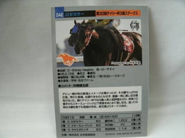 | ☆☆☆商品説明☆☆☆ 【メーカー】 バンダイ 【シリーズ】 95年サラブレッドカード 【番号】 042 ロゼカラー 【種類】 GⅡカード 【数量】 1枚 サラブレッドカードの第1弾95年度のカードになります。 |