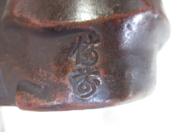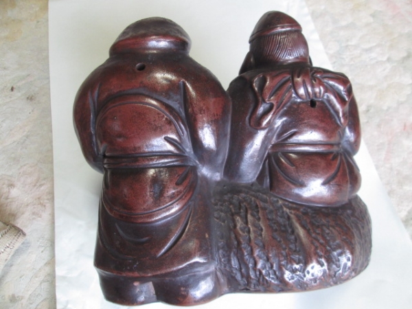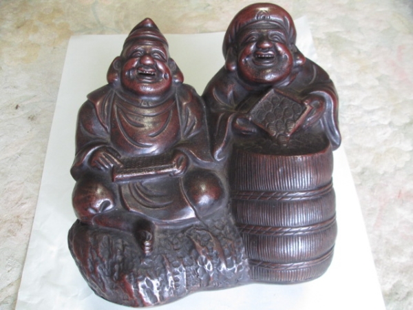 算盤を手にした大黒様と枡に入った小判を抱えた恵比寿様の古備前です。大きさは高さ約21センチ、幅約21センチ、奥行き約12.5センチ。重さは家庭用秤で約1.8キログラム。『備前』の窯印が恵比寿様のふくらはぎ部分になされていて明治期の作品かと思われます。大黒様の足の親指の先が欠損していますが、その他、割れやかけ、ヒビなどの瑕疵はありません。