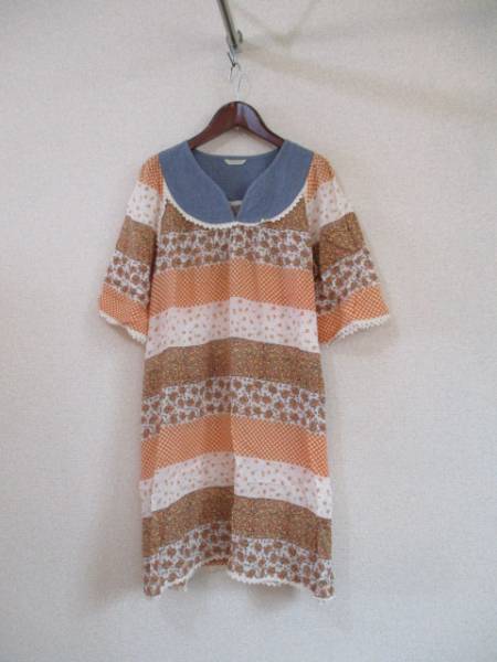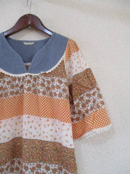 商品紹介 | オレンジを基調とした花柄のチュニックです。 襟元はシャンブレー素材が使われています。 シャンブレーの下と袖の付け根、袖口、裾には白いレースが付いています。 袖・身頃ともにAラインのふんわりとした形です。 色はオレンジの他、白、茶、カーキ等が使われています。 《素材》 綿100% |