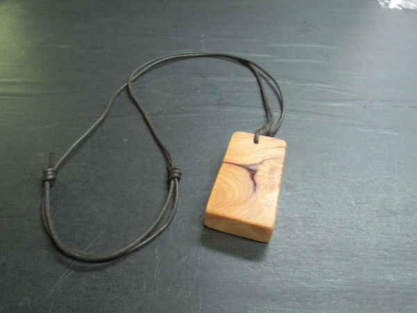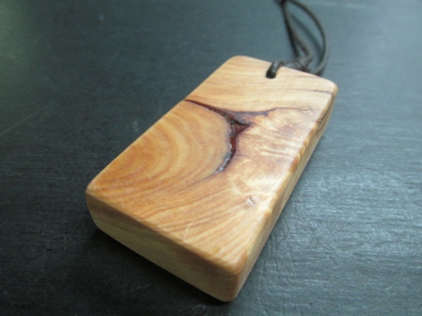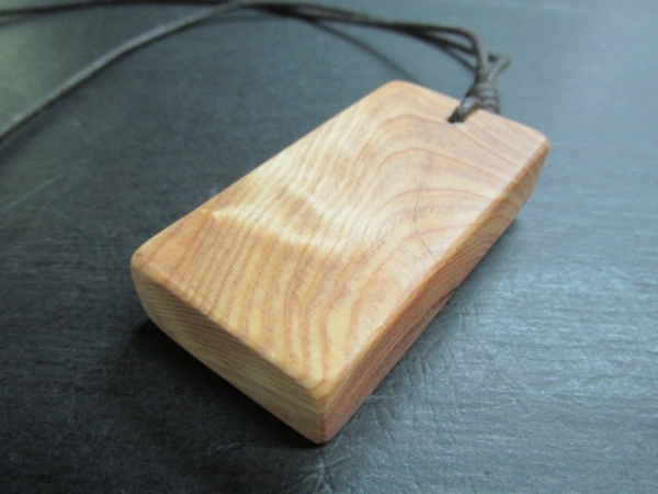 飛騨地方の深い雪の重みで大きく湾曲し一部が瘤化した異形の老桧、製材すると針葉樹としては大変珍しい美しい瘤杢が現れました。瘤化した桧には入り皮や割れそれに深い亀裂なぞが入っており木取りには大変苦労しました。その桧を使ってペンダントを作りました。仕上げは蝋仕上げで仕上げました。