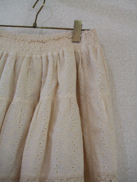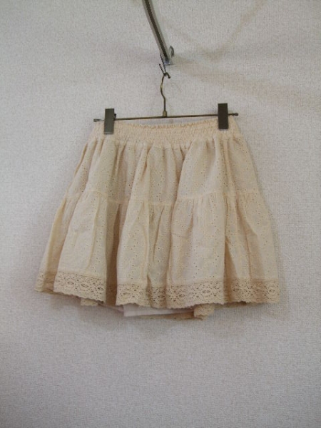 商品紹介 | 表地はフレアミニスカート、裏地はキュロットの形をしたボトムスです。 穴あきの刺繍が入った生地になっています。 ギャザーでふんわりとした形がカワイイです。 色は薄いベージュ(キナリ)です。 《素材》 表地・レース部分:綿100% 裏地:ポリエステル100% |