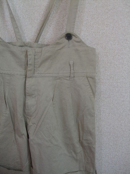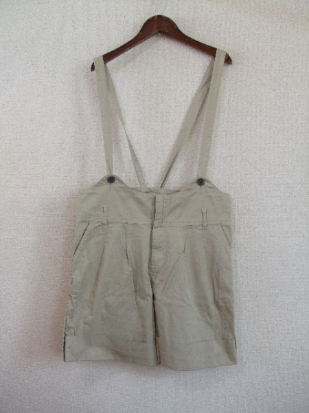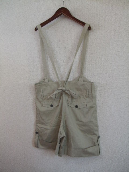 商品紹介 | 肩紐が付いたつなぎの形をしたハーフパンツです。 肩紐は後ろのベルト通しに通して結ぶデザインになっています。 色はベージュです。 裾は折り返して、ボタンで留めるようになっています。 《素材》 綿100% |