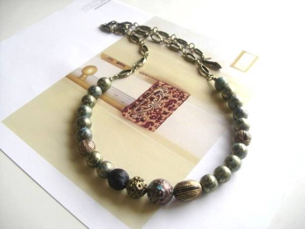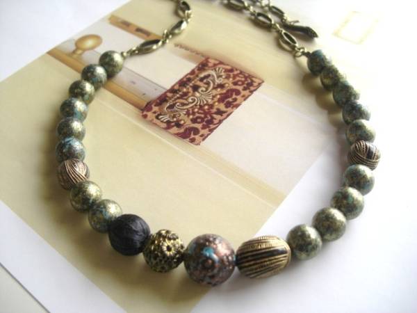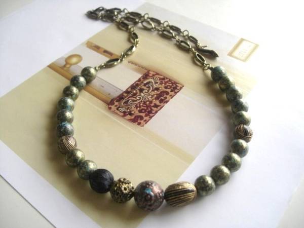 私らしさを+して・・シリーズです♪初夏のオリエンタル・・シックな異素材のネックレスです♪キュートな異素材が大人可愛いネックレスです♪12ミリから 20ミリ位までのデザイン樹脂ビーズや布ビーズやアンティークビーズにデザインチェーンを合わせました♪シックな色と柄でまとめてオリエンタルな表情です♪長さは全長70センチ位で調節自由です♪チョーカー風にされても素敵です♪お揃いのブ レスレットも出品しています♪シンプルで飽きのこないいつまでも着けられるデザインを考えて作りました♪ハンドメイドをご理解頂いてノークレー ム、ノーリターンでお願いします
