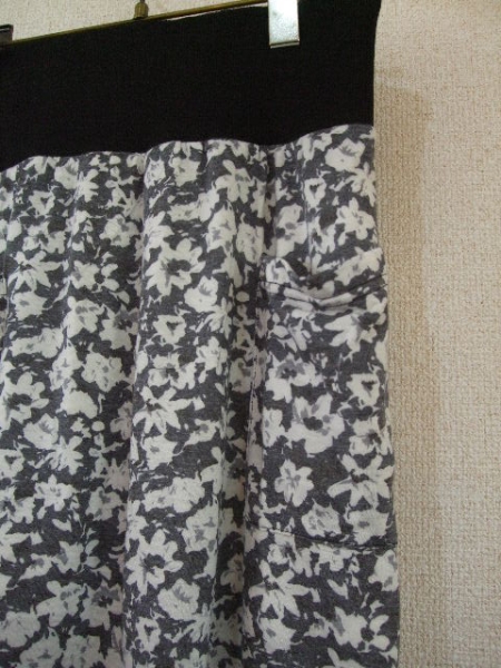 | 商品紹介 | 白い花柄がプリントされたフレアミニスカートです。 グレーの地色に、プリント部分はこげ茶と白が使われています。 ウエストは黒のリブ素材で、両サイド下側に少し大きめのポケットがあります。 《素材》 表生地:ポリエステル65% レーヨン35% リブ部分:綿95% ポリウレタン5% 裏生地:ポリエステル100% |