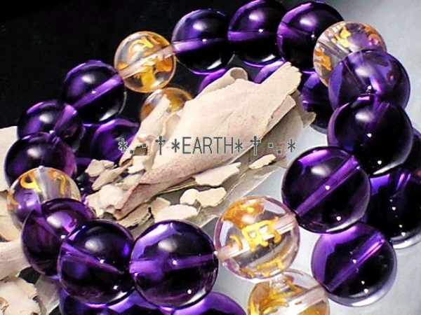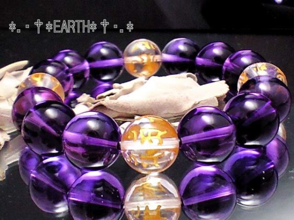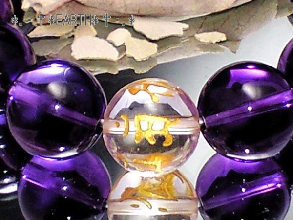 天然石★12ミリ金彫十二支七種梵字水晶&紫水晶アメジスト 数珠 | |