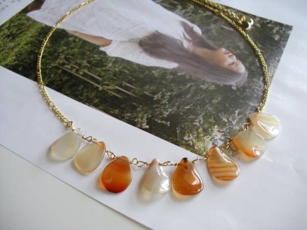女の子・スタイル・・シリーズです♪可憐な花びら・・儚げなカーネリアンのネックレスです♪花びらのようなカーネリアンを紡いでロマンチックな表情です♪カーネリアンは15×18ミリ位です♪長さは全長72センチ位で調節自由です♪チョーカー風にされても素敵です♪お揃いのブレスレットやピアスも出品しています♪ハンドメイドをご理解頂いてノークレーム、ノーリターンでお願いします