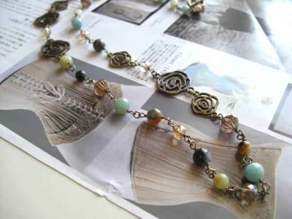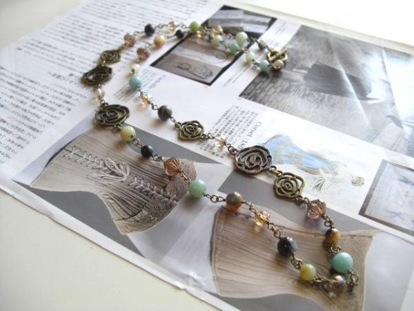 アンニュイ気分で・・シリーズです♪密やかな薔薇・・シックなアマゾナイトのネックレスです♪ナチュラルなお色のアマゾナイトにチェコビーズや 薔薇の透かしチャームを合わせて可憐な表情です♪6ミリ、8ミリの丸玉のアマゾナイトはデザイン違いのチェコビーズや薔薇の透かしチャームを合わせました ♪長さは全長77センチ位です♪2連にされてチョーカー風にされても素敵です♪お揃いのネックレスやブレスレットも出品しています♪シンプルで飽きのこないいつまで も着けられるデザインを考えて作り ました!ハンドメイドをご理解頂いてノークレーム、ノーリターンでお願いします