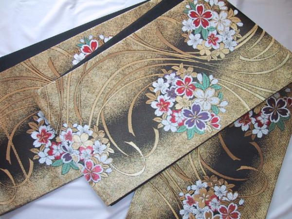 金+黒金地(裏地はくろ)かいきり(たれ先柄立ち上がり)~かいきりなし(手先柄はし)まで約440,5cmですので、出来上がり予想は約436cmです。巾31,1cm1738