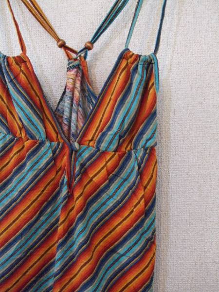 商品紹介 | ブルー系とオレンジ・エンジ系の斜めのマルチボーダーキャミソールです。 胸元はやや深く開いていて、中央をボタンで留めるようになっています。 肩紐の後ろには木のビーズのような飾りに通してあるデザインです。 《素材》 綿80% 麻20% |