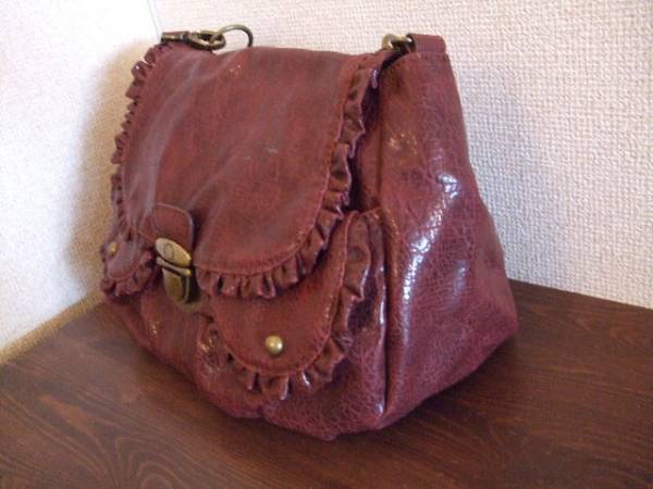 | 商品紹介 | エンジカラーにシワ加工、フリル使いが可愛いハンドバッグです。 素材は表記がありませんが、合皮だと思います。 |