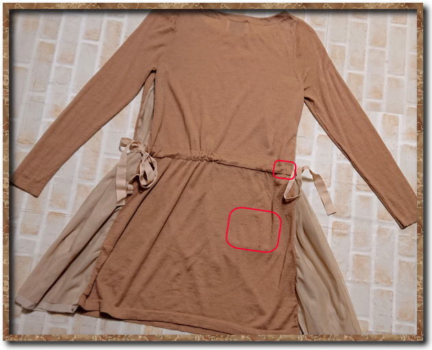 ・4枚目写真の大きい枠の位置に穴が4ヵ所、糸抜けが1ヵ所あります。 ・4枚目写真の小さい枠の位置に穴が1ヵ所あります。 5,6枚目に拡大写真を載せてありますのでそちらもご確認ください。 ダメージを除けば全体的な状態は良好です。 生地は薄手です。 |