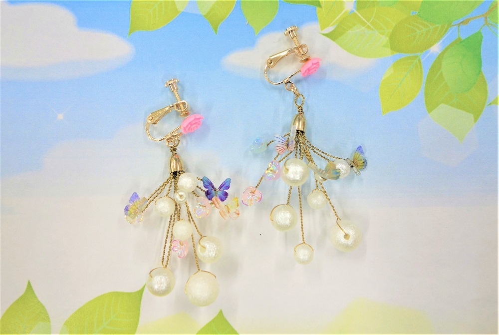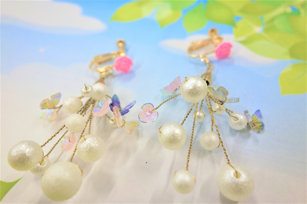 素材:ワイヤー、プラスチック製ビーズ、アクリル製花、アクリル製蝶々