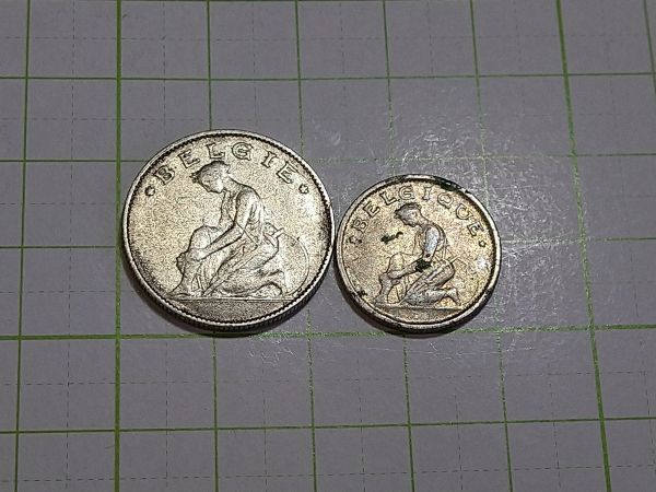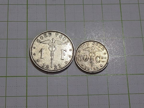 1922年 ベルギー 王政 1フラン 50サンチーム硬貨 コイン 2枚組 カドゥケスの杖 ケーリュケイオン