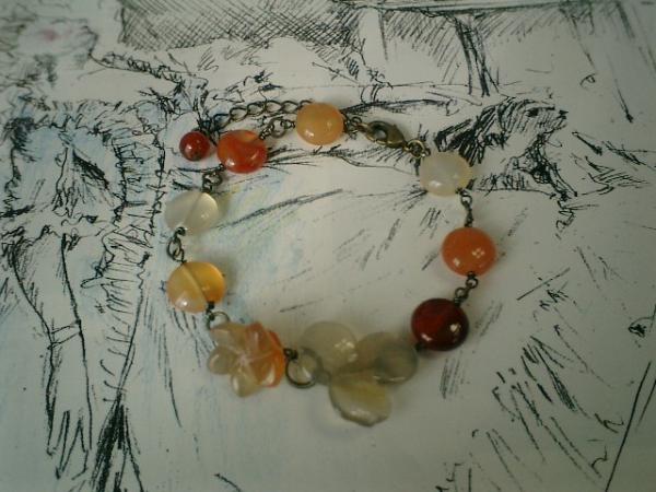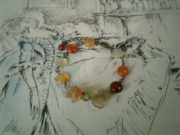 ハラハラと♪シックなお色のカーネリアンのブレスレットです♪カーネリアンの花びらは大きな方が25ミリ位、小さな方が15ミリ位です。複雑な濃淡の花びらが表情があって可愛いです♪10ミリのコイン型のカーネリアンと合わせました♪可憐です。長さは全長22センチ位で調節出来ます♪シンプルなデザインなので長く着けて頂けると思います♪お揃いのネックレスも出品しています♪ハンドメイドをご理解頂いてノークレーム、ノーリターンでお願いします
