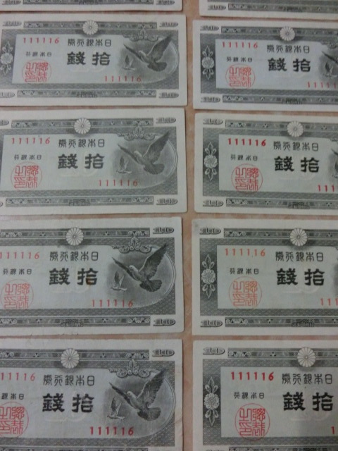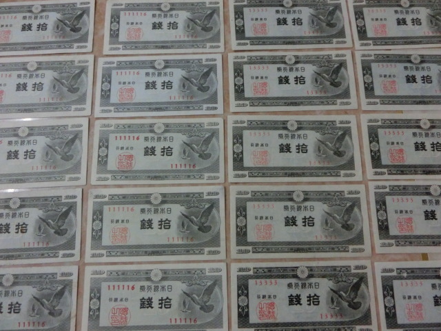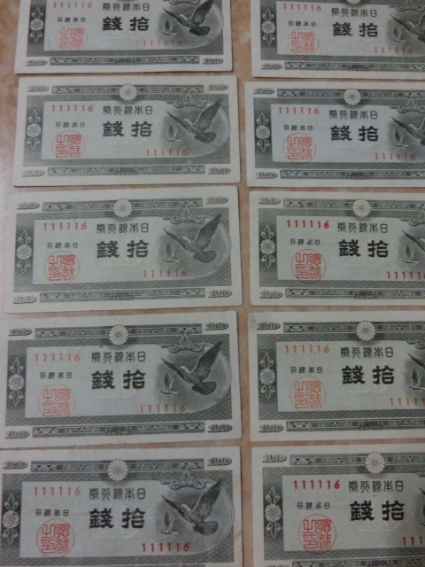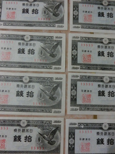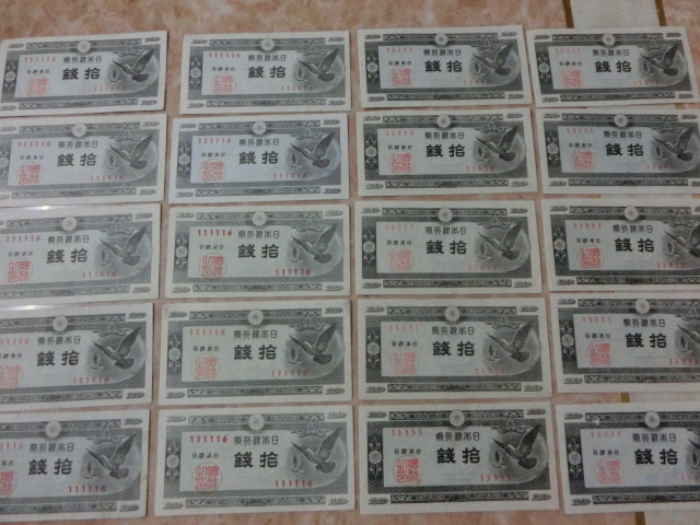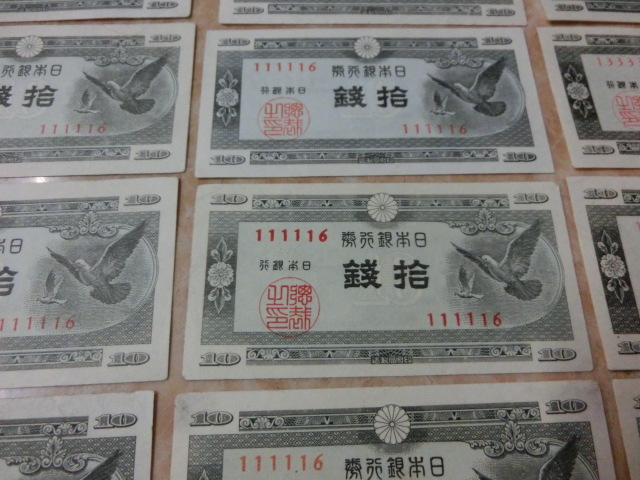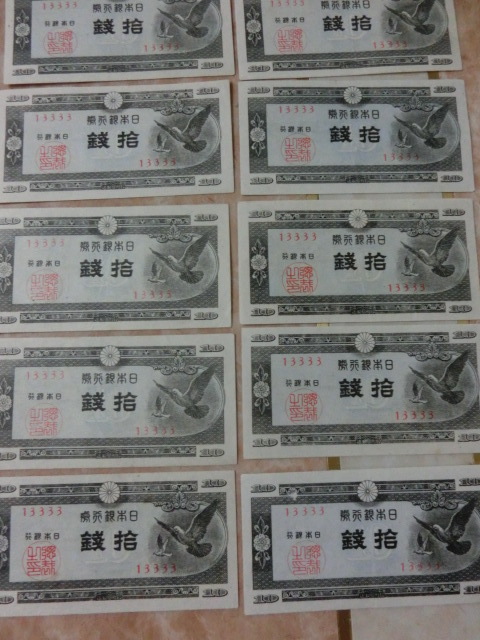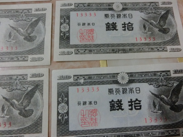 日本銀行券A号 ハト10銭のラッキーナンバーが良い111116番を10枚、13333番を10枚の計20枚です。