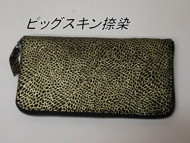 『通気性・吸湿性・柔軟性・耐寒暑性・非帯電性などの特性を持つ素材豚革、これに伝統の捺染加工をしたものが捺染豚革』この捺染豚革のラウンドファスナー式長財布です。