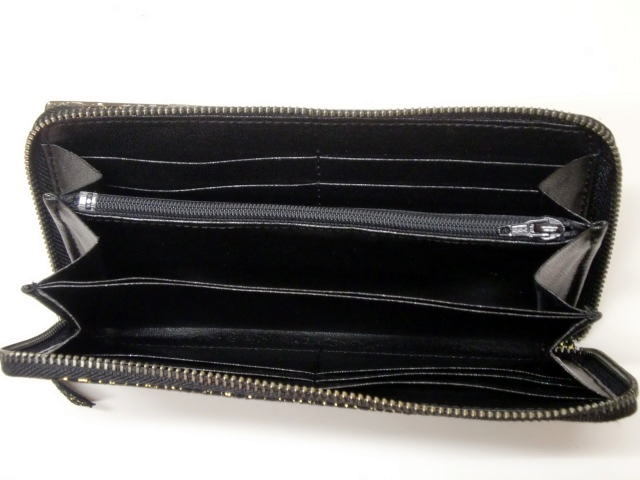 開閉口はファスナー、内に小銭など入れるファスナーポケット・チケット・レシートなどを入れるガードポケット・両サイドにカードが各4枚計12枚入るカードポケット・