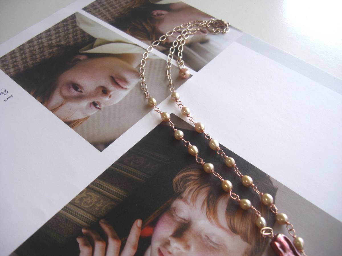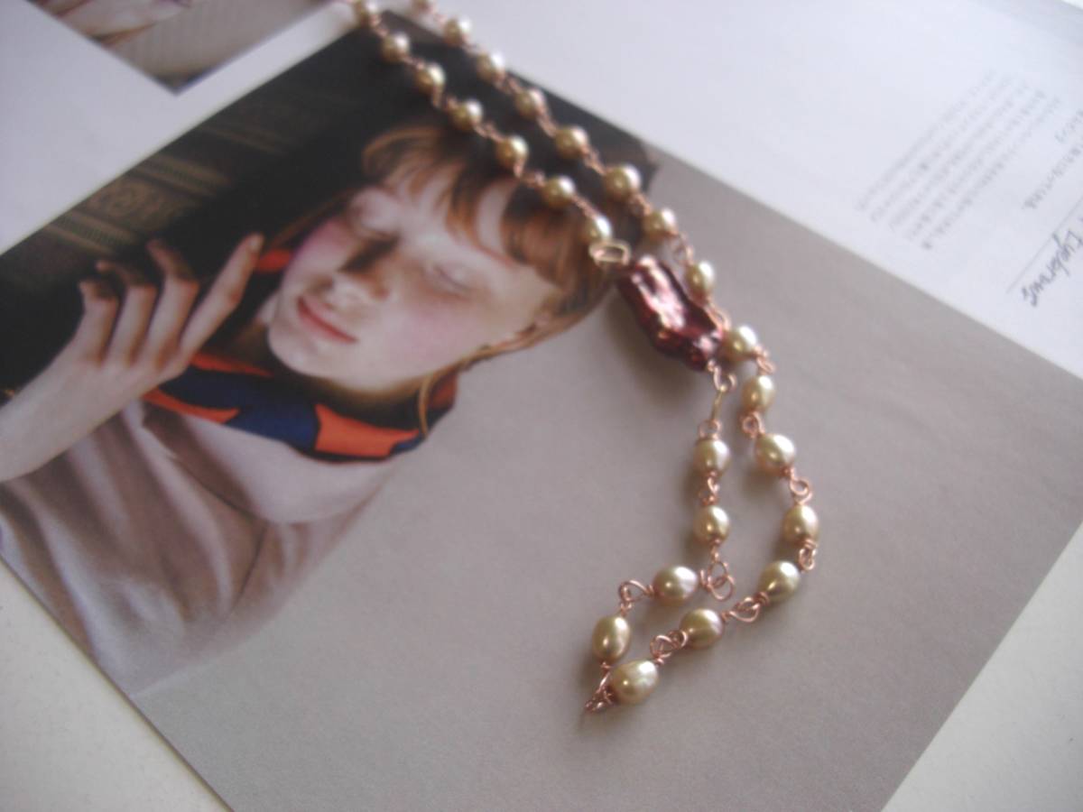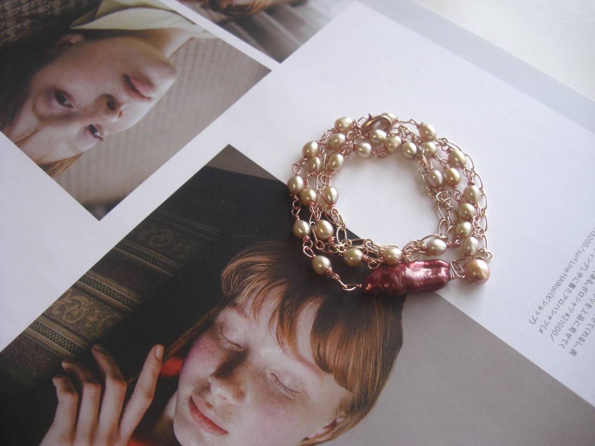 お揃いコーデ・・シリーズです♪やさしいピンクパールの一揃い・・やさしいピンクパールの淡水パールのネックレスです♪5ミリ位のライス型の淡水パールにダーク レッドのステック型の芥子パールを合わせました♪長さは全長74センチ位で調 節自由です♪画像のようにブレスにされても可愛いです♪シンプルで飽きのこないいつま でも着けられるデザインを考えて作りました!ハンドメイドをご理解頂いてノークレーム、ノーリターンでお願いします