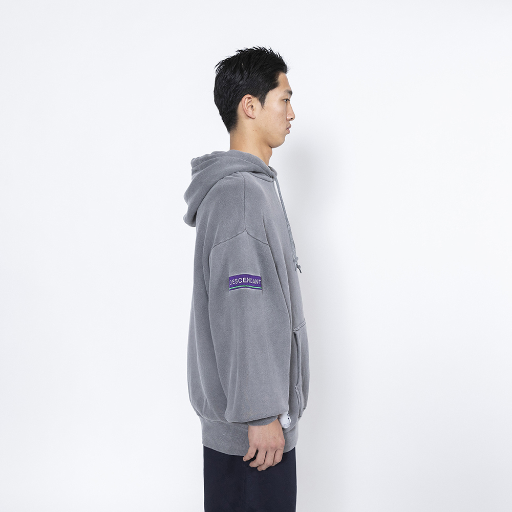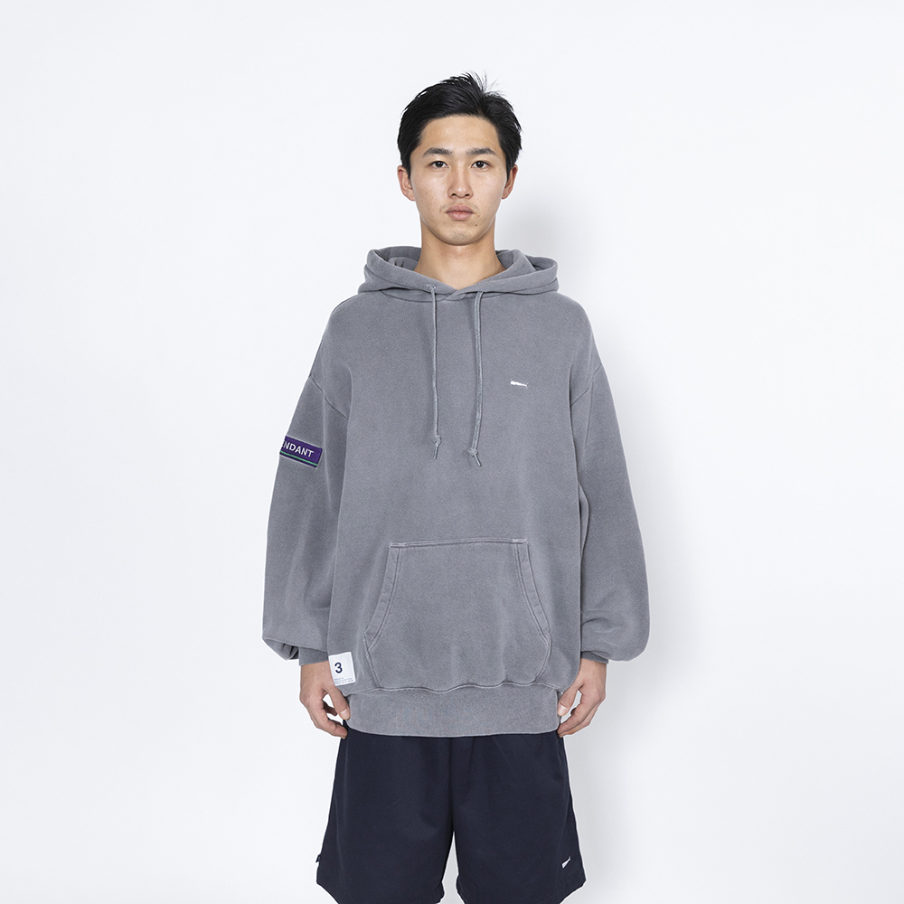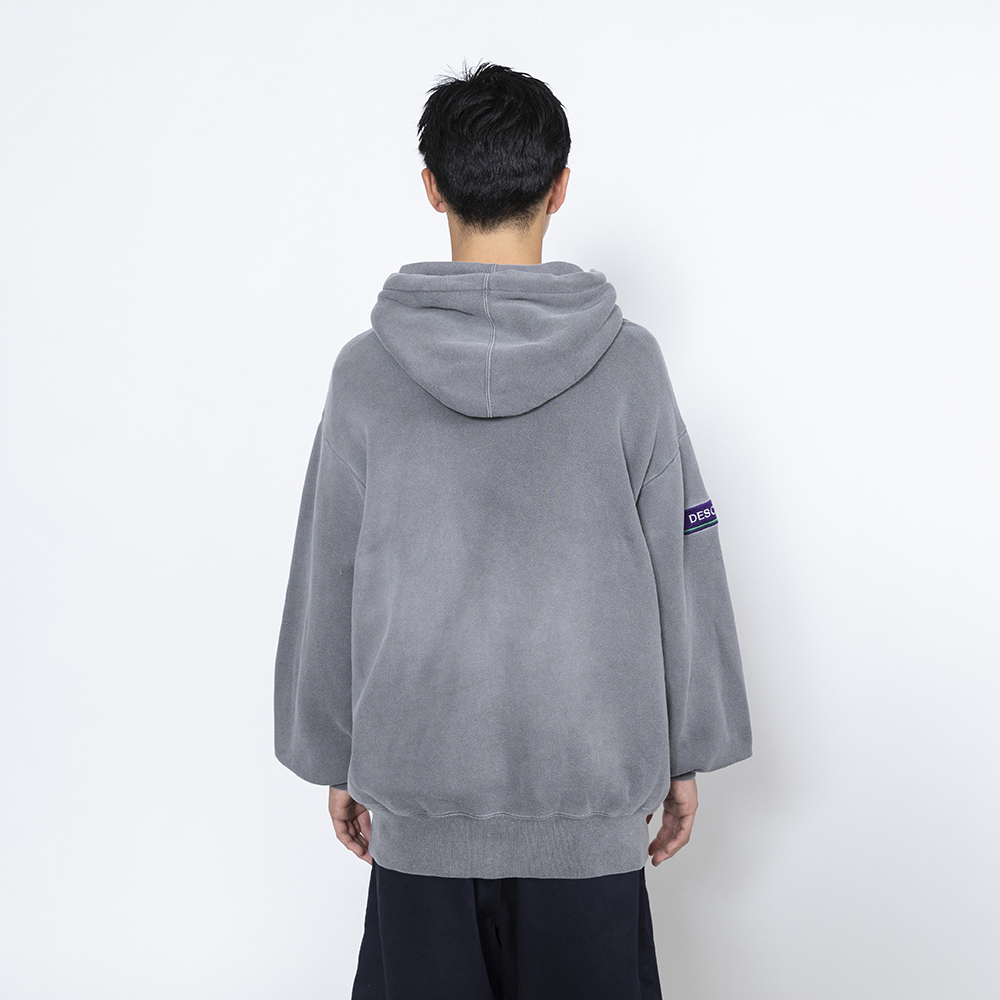 ●裏起毛コットンテリーにピグメントダイ加工を施し、色褪せたトーンを表現したフーデッドスウェットシャツ。