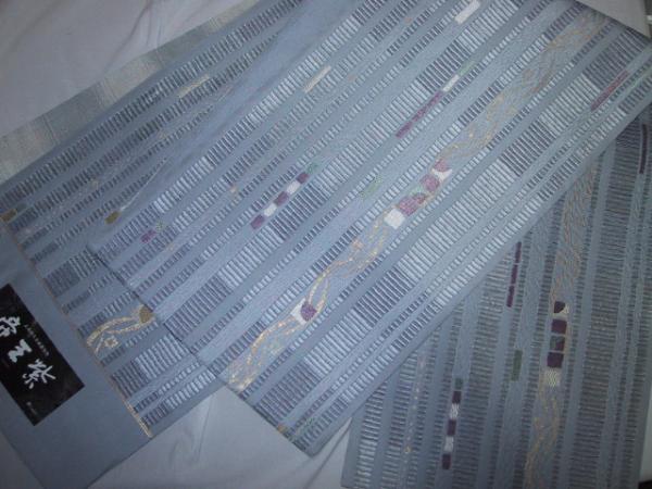 おもに訪問着(おしゃれ向き)用六通柄袋帯です じゅらく 『帝王紫』ブランド 西陣 絹100%金属糸等使用 新品み仕立て品 薄灰地。(紫は太鼓、前太鼓部分)