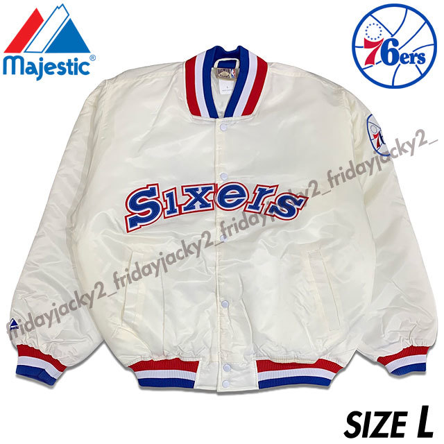 稀少■MAJESTIC (マジェスティック) NBA HARDWOOD CLASSICS 90s-00sヴィンテージ 76ers SIXERS (セブンティシクサーズ)スタジャン 白 L ①