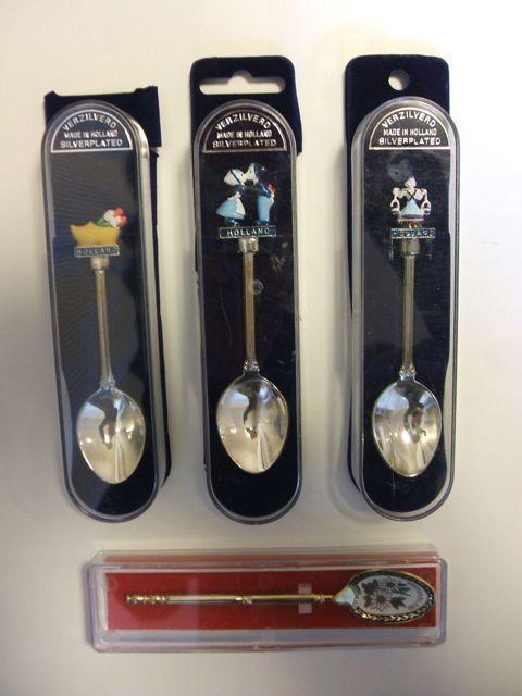 スプーン3本。Silverplated。Made in Holland。VERZILVERD。おまけのスプーンはスイスのお土産です(Silverplatedではありません)。全てケースに入れたままの状態で保管していましたが変色があります。ケースも壊れていたりします。あらかじめご了承の上、ノークレーム・ノーリターンでお願い致します。他にも同様のグッズを出品していますので、ぜひご覧下さい。