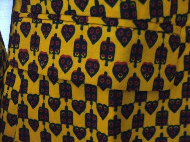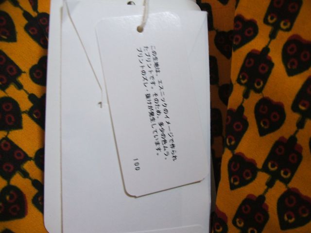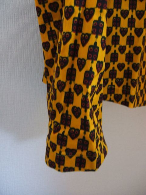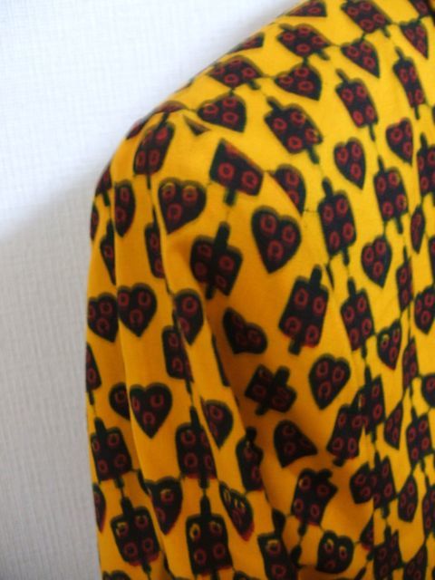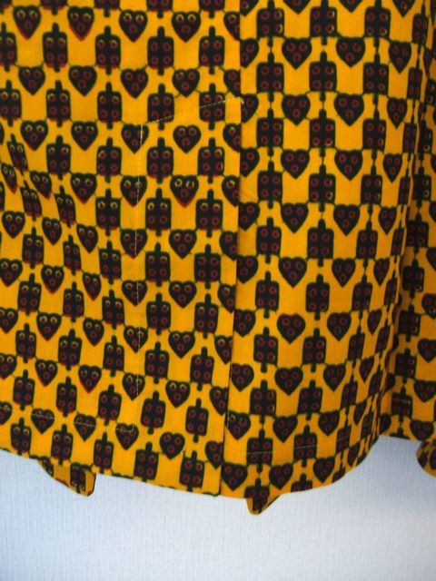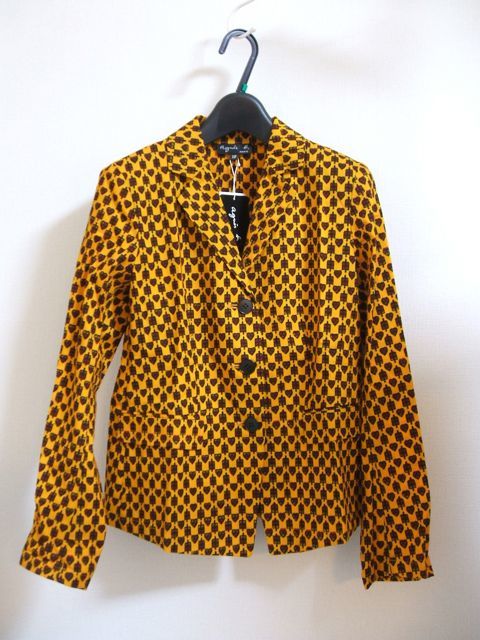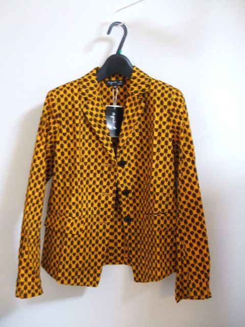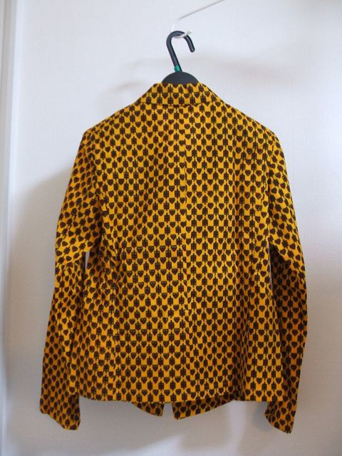 エスニックのイメージで作られたプリントだそうです。定価46,200円。綿100%。わりと薄手ですがインド綿ほどではありません。日本製。ポケット2つ。肩パット付き。袖口にボタンはありません。