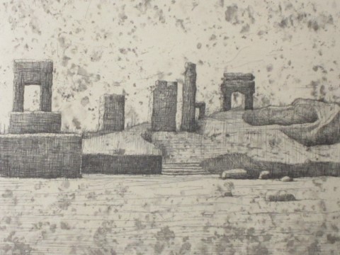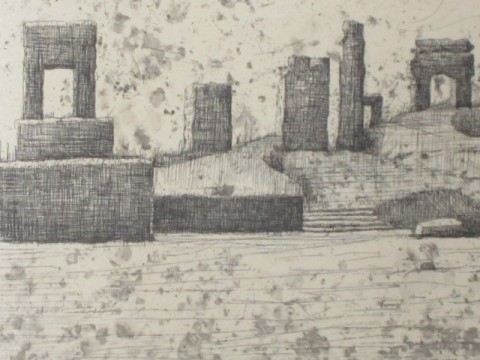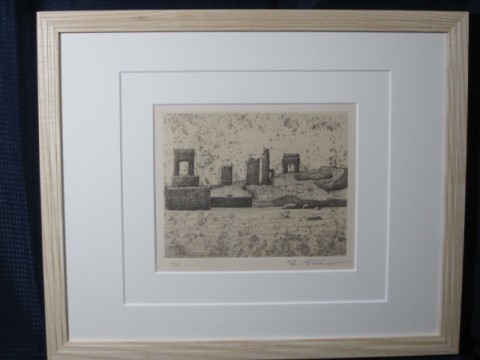古典的な構図とセピア色の色調を持つ繊細・優美な銅版画作品「風化」です。