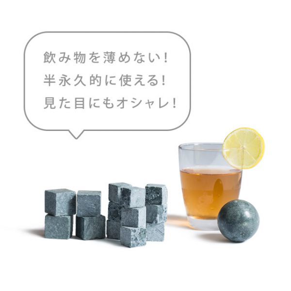 | 溶けない石の氷 9個セット ウィスキー ストーン 氷の石 収納袋付き アイスキューブ Whisky stone ウィスキーを薄めずに冷やす ユニークなオンザロックス 天然石のアイスキューブ お洒落に演出!ギフト9個セット 氷と違って溶けることがないので、飲み物を薄めることなく 最後まで飲み物本来の味を楽しんでいただけます。 飲み物だけでなく、冷やして食べたい料理やスイーツなどにも使えそうです。 見た目にもちょっと目を引くスタイリッシュな演出ができます。 水で濡らせて冷凍庫で冷やし、氷の代用品として冷たい飲み物などを保冷するストーンキューブ。 オンザロックなど、飲み物に使用するだけでなく、冷たいままで食べたい食材の下に 敷いて食卓に出すなど、使い方はいろいろ。 溶けて薄まることがないので、ウィスキーやアイスティーなど飲み物や 食材の味を変えることがないのでお薦め。 洗って繰り返し使用できるだけでなく熱湯消毒も可能で、経済的かつ清潔に使える。 必要な数だけ使うことができるので、全て冷やしてワインクーラーに入れたり、 卓上で冷酒がぬるくなるのを防ぐために2~3個使うなど、 用途によって調整できるのが嬉しいです。 冷凍庫で2~3時間冷やすと、氷のような保冷剤としてお使いいただけます。 保冷力は氷に比べて少し劣るので、常温の液体をキンキンに冷やすというよりは、 冷たい飲み物を保冷するイメージです。 天然石で、主成分はタルクとマグネシウム。耐熱は氷温から800℃まで パッケージもオシャレなので贈り物にもおすすめ。 誕生日プレゼントや結婚祝い、父の日ギフトなどにもぴったりです 【特長】 北欧ではワインクーラーに氷とオンザロックスを一緒に入れて使うこともあります。 ストーンには浸透性がないので、味や臭いが移ることはありません。 お手入れはとってもシンプル。すすいで、乾かしてください。 演出上手なかっこいいアイテム!専用保管袋付き! お酒の風味を適度に和らげる際には最高です。 使い方は簡単 使用前に2~3時間冷凍庫で冷やします。 グラスに キューブ入れてからお好みのお飲み物を注いでください。 飲料をキューブの高さに達するまで注ぐのが目安!数分間放置した後、お楽しみください。 とても軽量で、ソフトな仕上がり 滑らかに研磨されており優しく使用いただければ、グラスを傷付けません。 キューブサイズは2x2x2cm 再利用可能できれいに洗って空気乾燥させた後 冷凍庫に保存。 いつでもお飲み物がおいしいオンザロックで楽しめます。 注意事項 飲み込まないでください。 自然石で作られている為、形が異なっています。 ※本製品は、保温力に優れた性質を持ちますが、氷と同程度の冷却機能はありません。 専用収納袋セット 9個セット サイズ:1個 20*20*20mm 重量:50g |