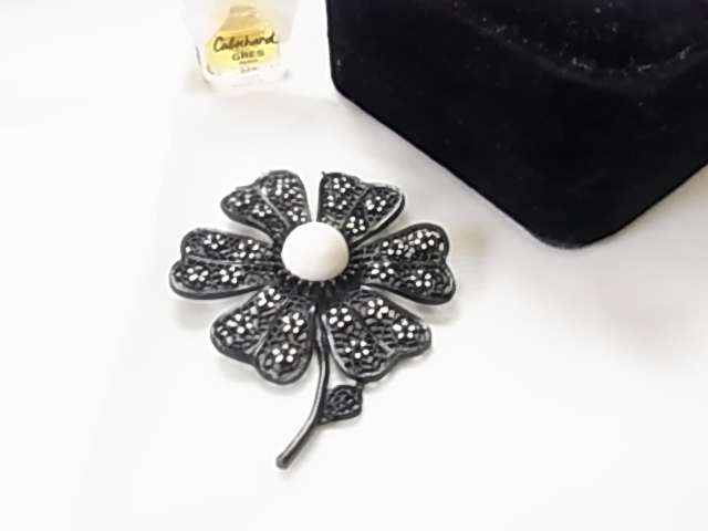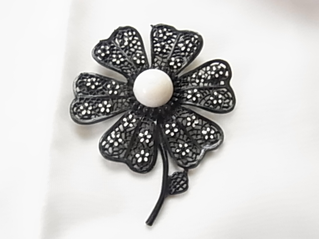 モノトーンカラー お花デザイン フラワーモチーフ 黒の透かしデザイン 中央は白の半円ストーン調 綺麗インパクト ブローチ▲