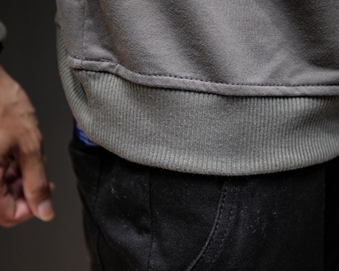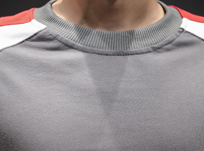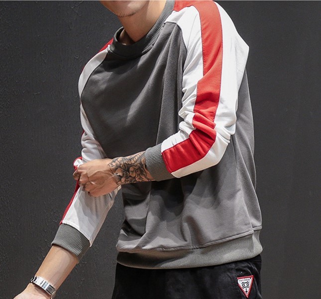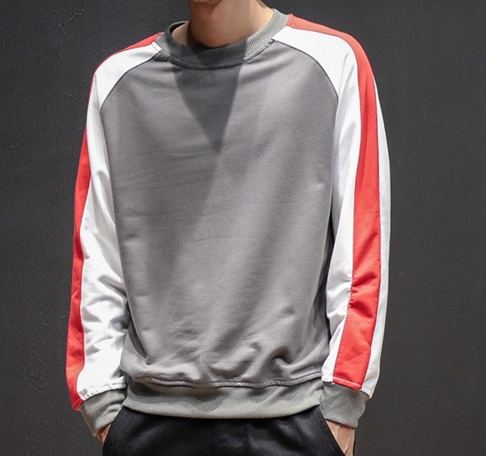 P メンズ トレーナー リブ ライン 袖 ボーダー 無地 デザイン カジュアル トップス 丸首 スウェット レッド 赤 灰 【グレー】【L】