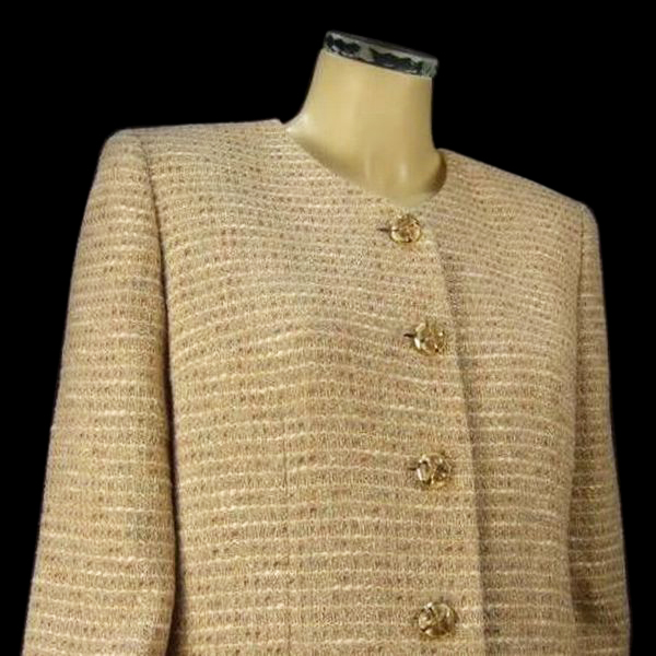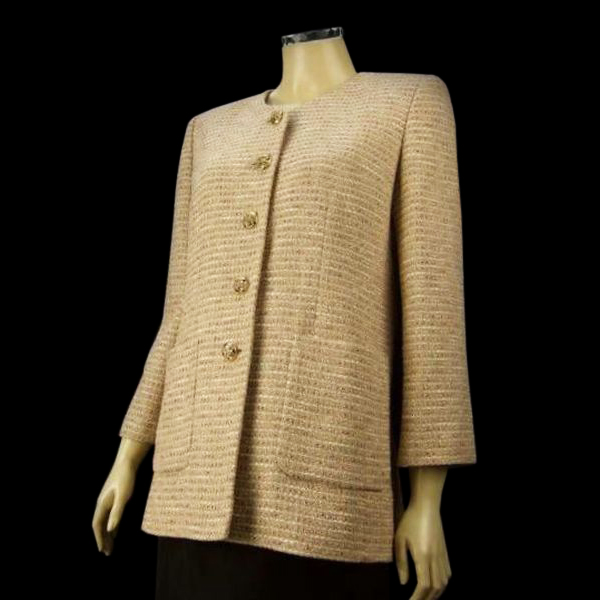 特徴:英国製生地使用!レリアンのシルク入り高級ツイードジャケットです(¥65000円のお品)。薄茶エクリュベージュ系(薄茶&ヌーディーベージュ系)を基調に光沢アッシュカラーな上品レインボーカラー入り織生地×金色&ガラス風フラワー型ボタン♪繊細なラメ入!!ノーカラー薄手ツイードロングジャケットです。(春初秋向き) ---↓ここにサイズ記入----