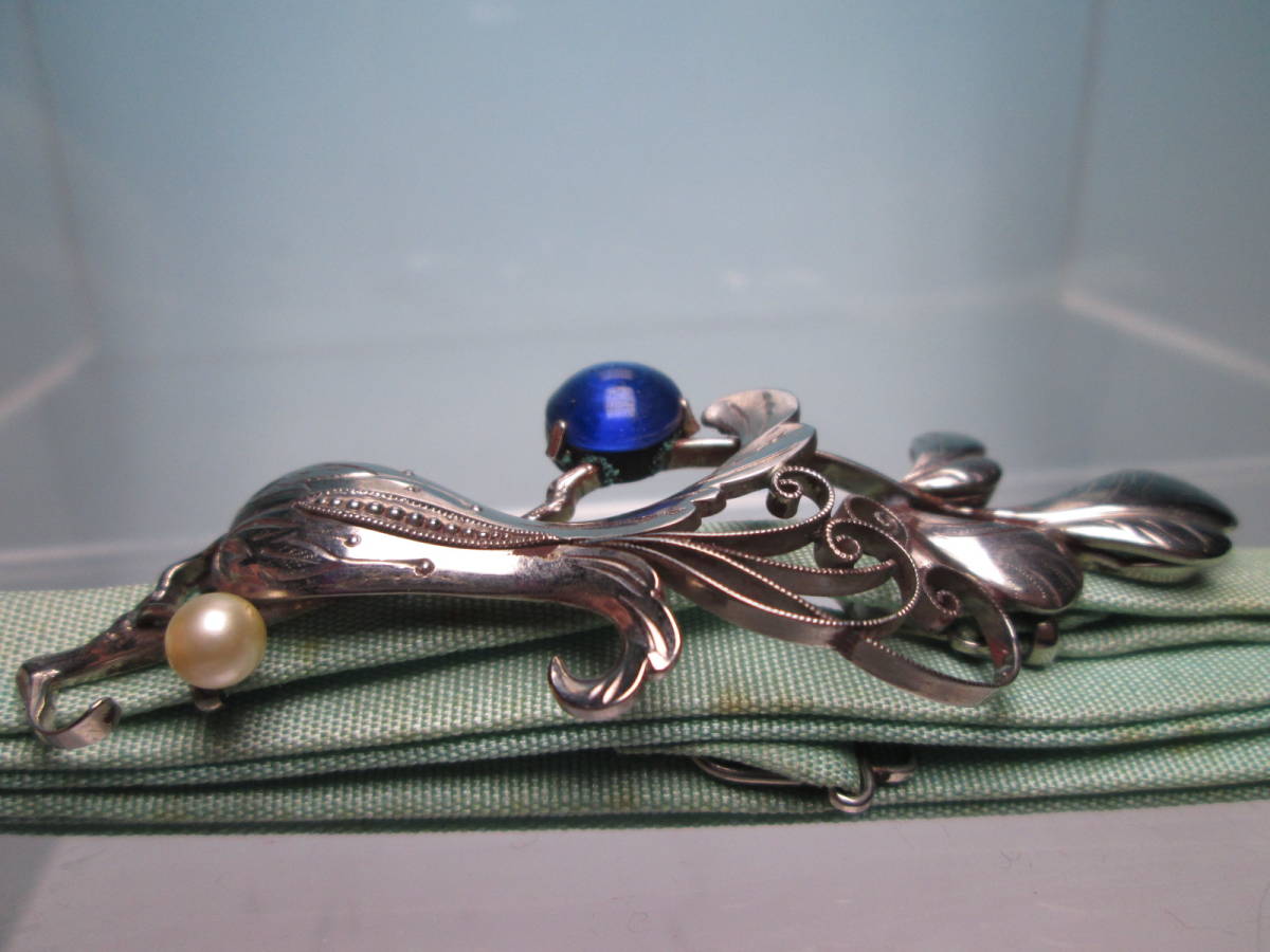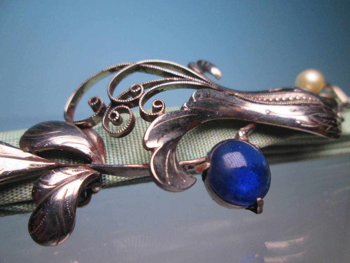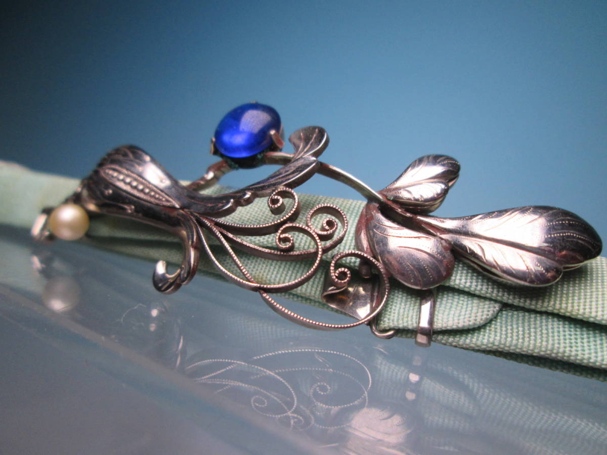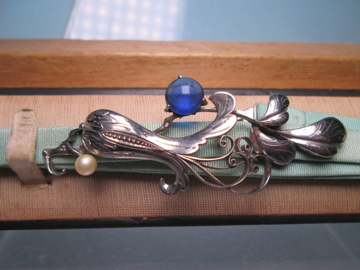 【江月】アンティーク・彫金細工 ブルー硝子/本真珠飾り 花の帯留め 木箱付