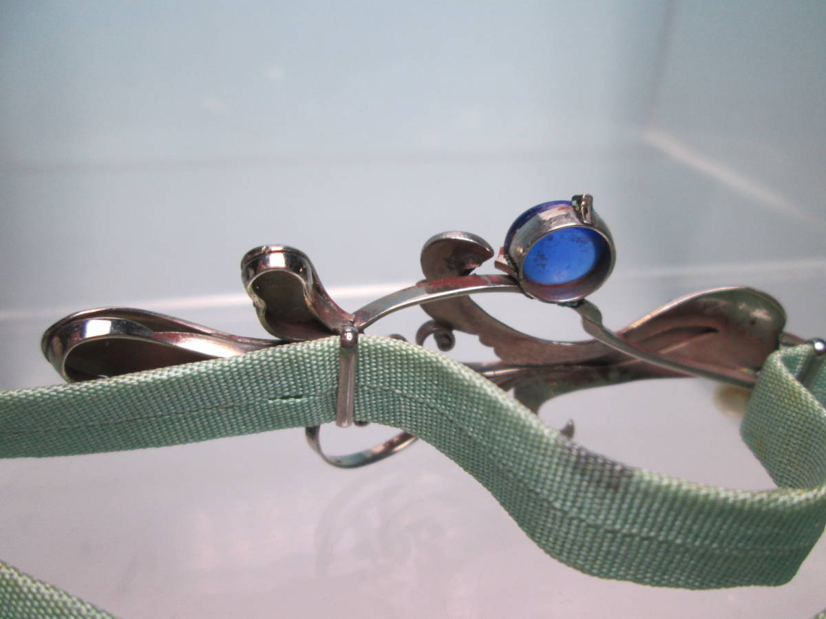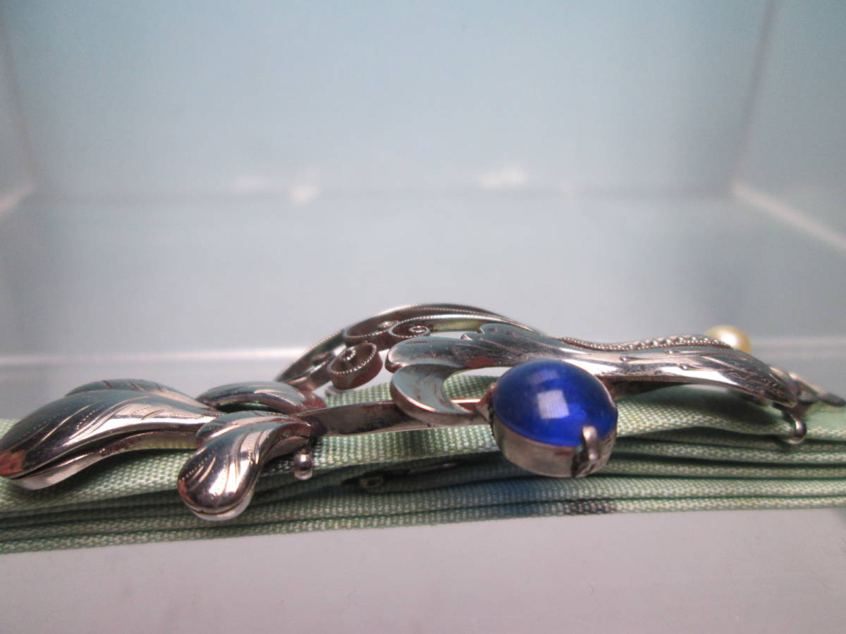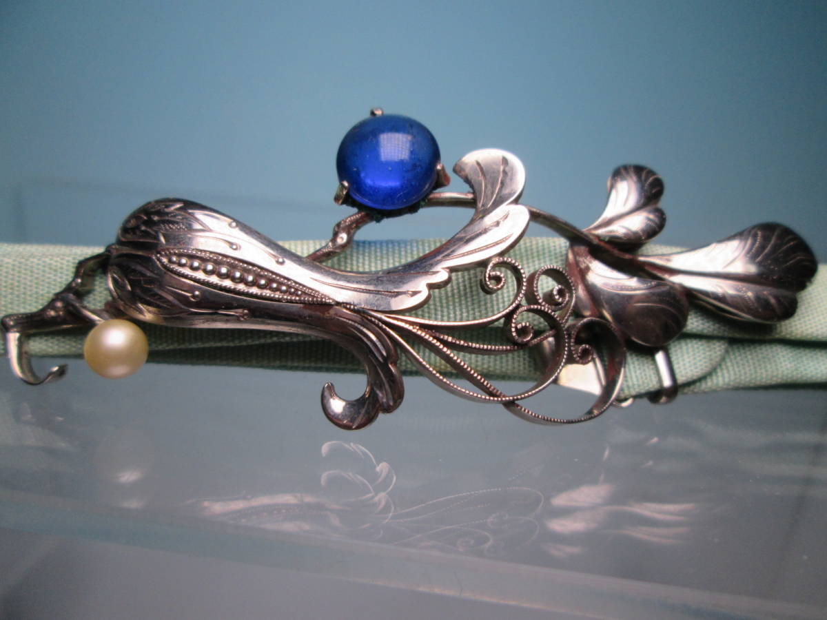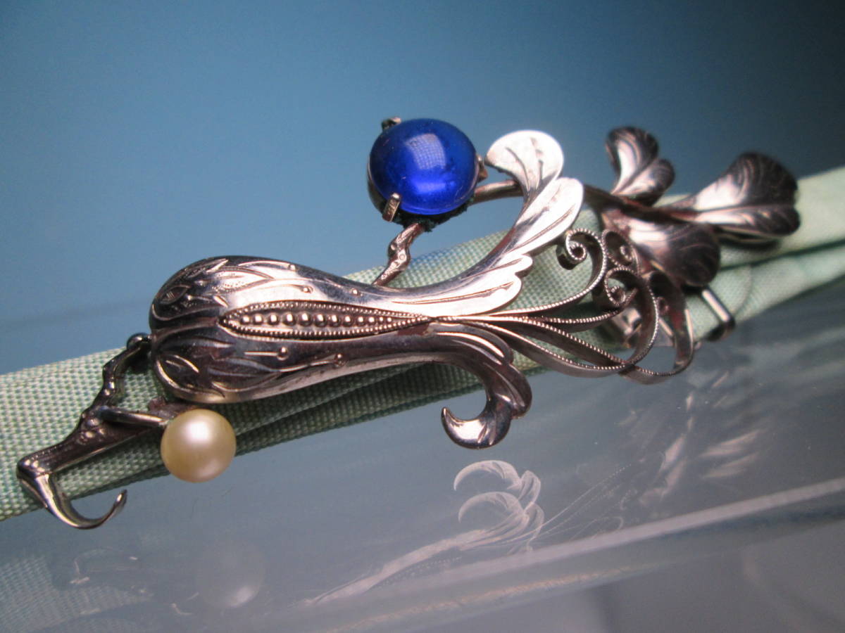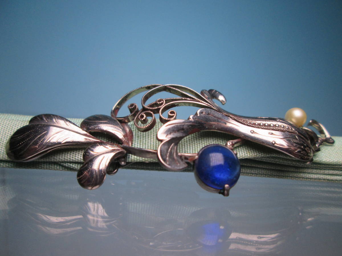 【江月】アンティーク・彫金細工 ブルー硝子/本真珠飾り 花の帯留め 木箱付