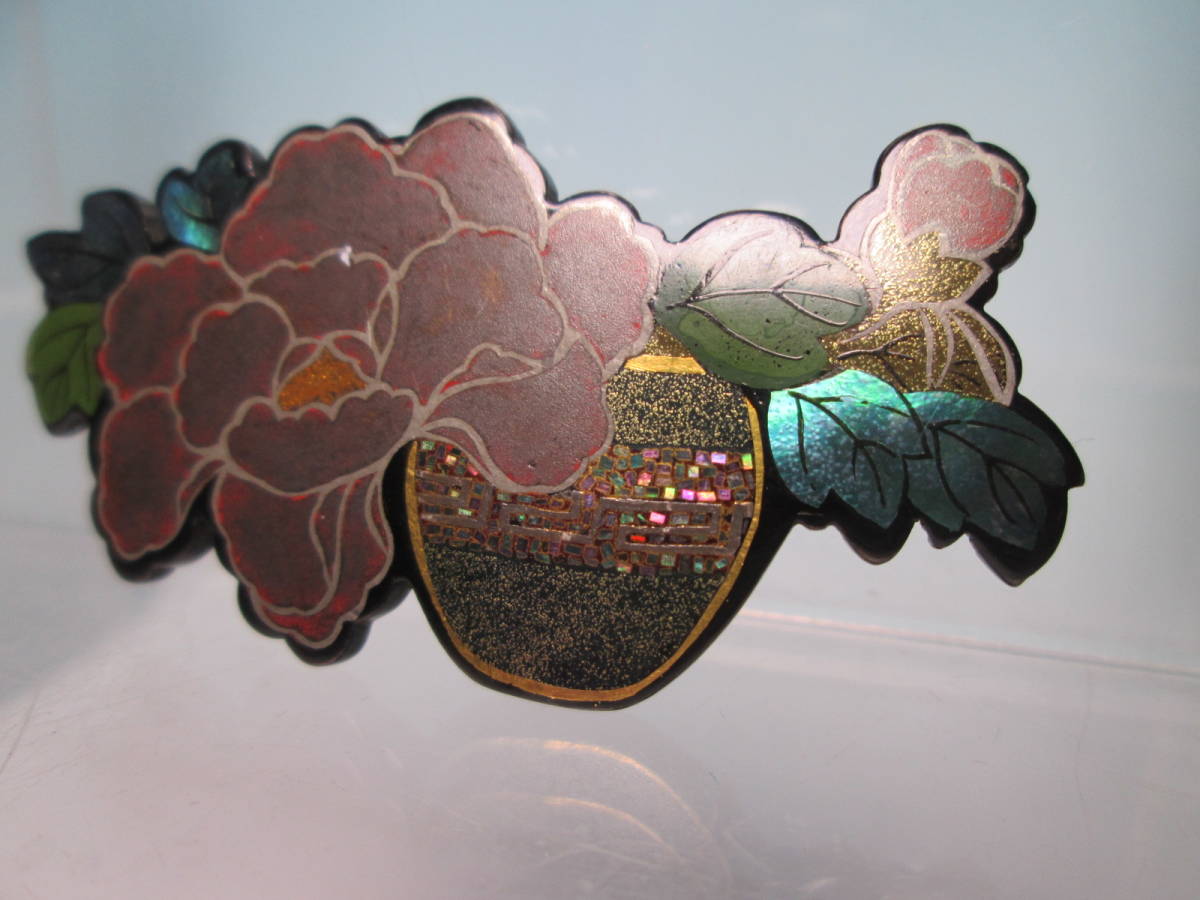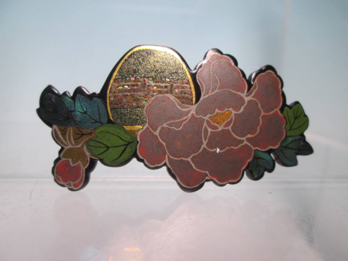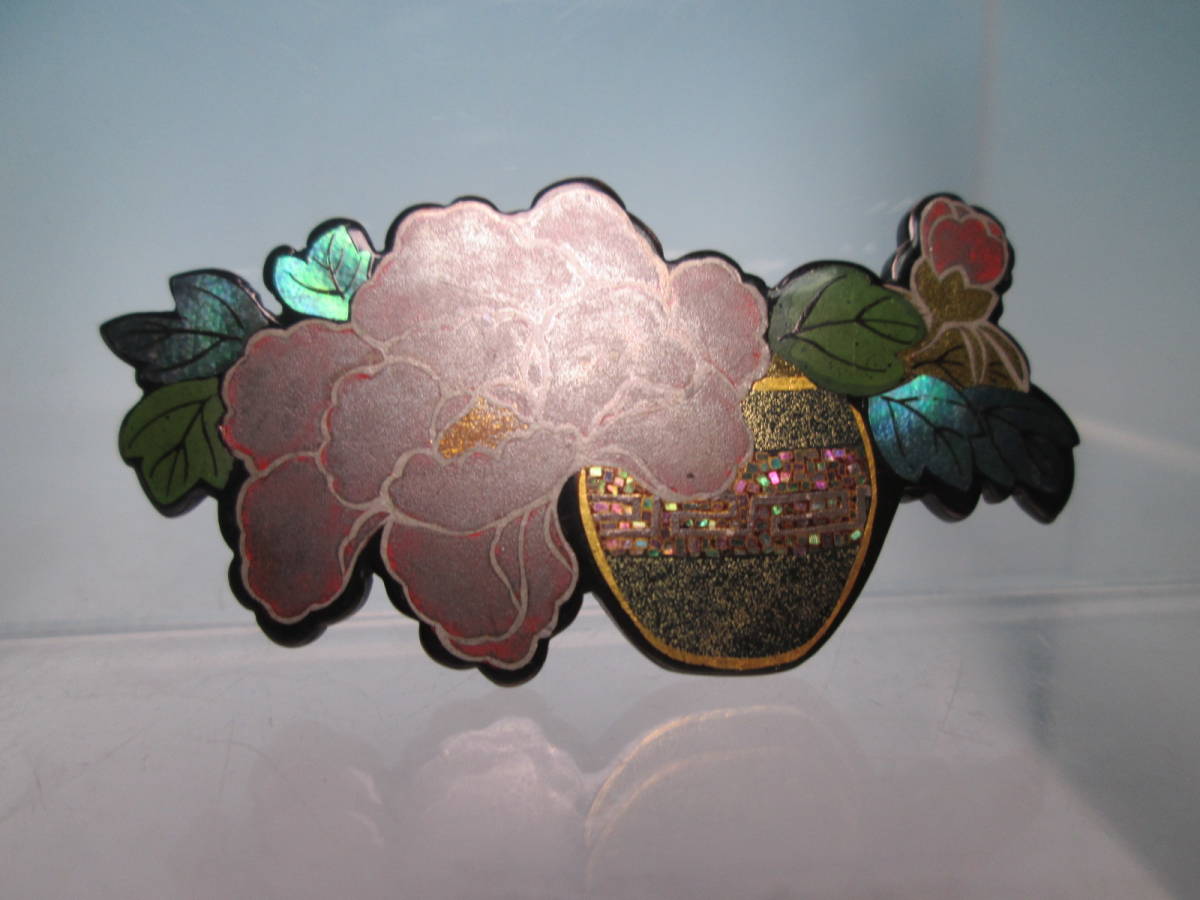 葉っぱ部分には螺鈿細工が施され、牡丹の花は銀、花瓶には螺鈿細工と金象嵌の細工です。