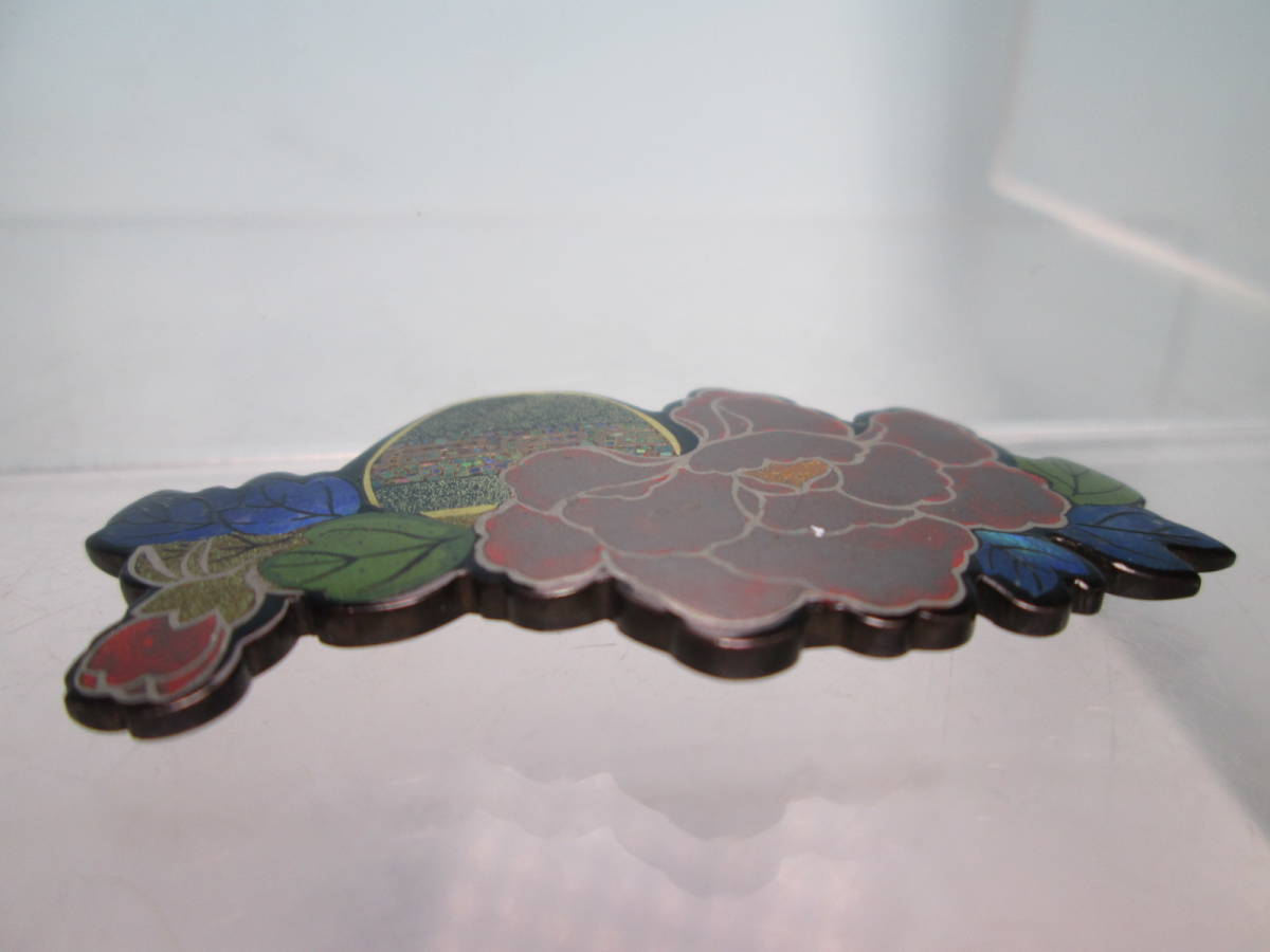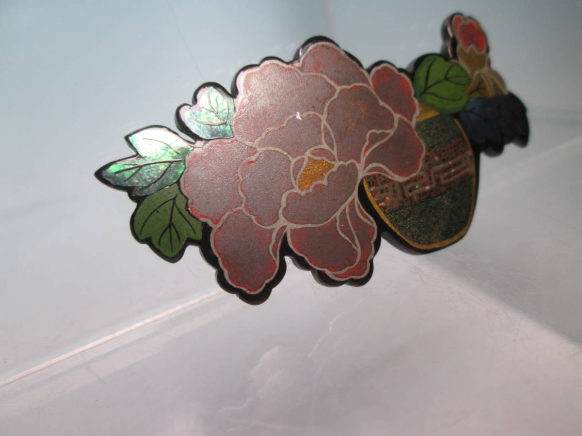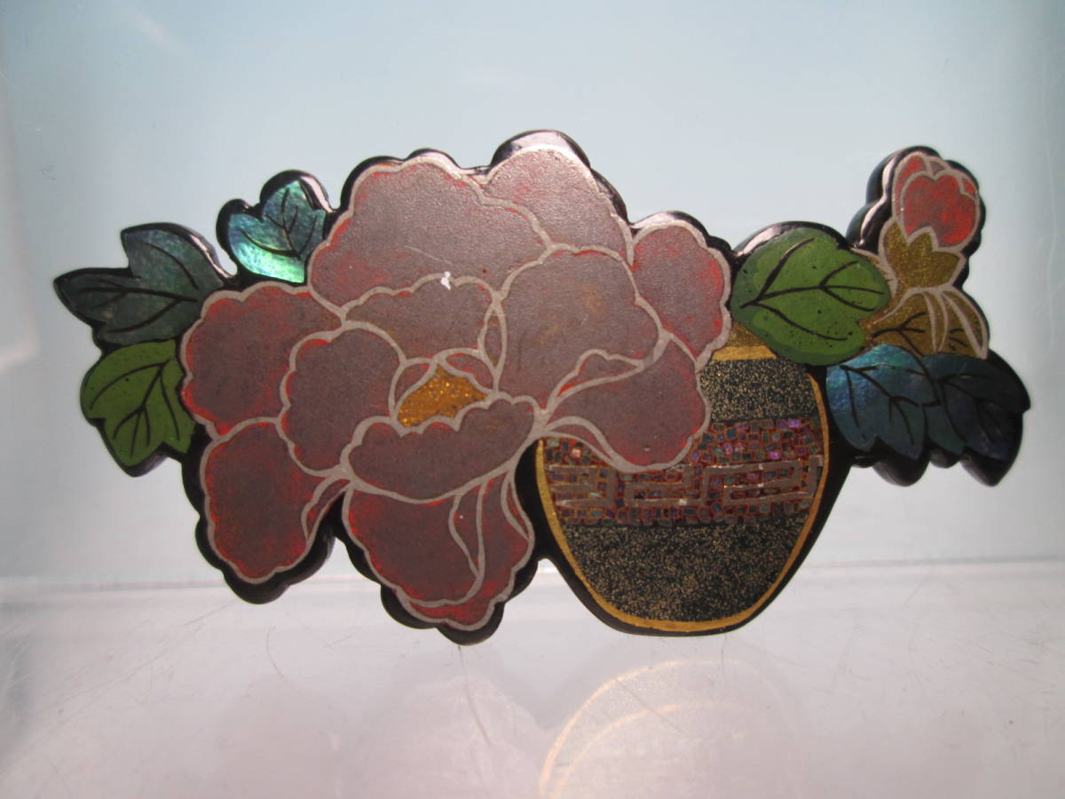葉っぱ部分には螺鈿細工が施され、牡丹の花は銀、花瓶には螺鈿細工と金象嵌の細工です。
