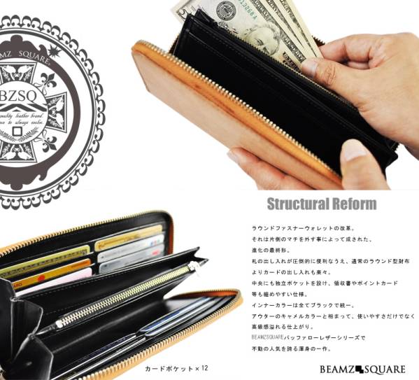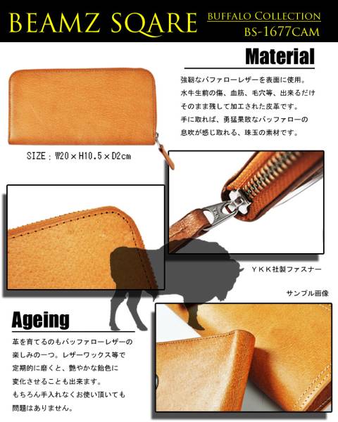 | ラウンドウォレットの革命!機能性抜群の片マチ仕様! 構造上、紙幣やカードの出し入れが圧倒的にやりやすく、 近年大人気のデザインです。 また、カードポケットを12ヶ所に加え、フリーポケットを6ヶ所装備。 ポイントカードや領収書なども別けて収納管理出来ます。 素材には丈夫で質感抜群のバッファローレザー(水牛革)を使用。 使えば使うほどに味の出るのが魅力の大人気素材です。 アウターのキャメルカラーが、 インナーのブラックカラーと相まって、 重厚感ある出来る男を演出します。 使いやすさとデザイン性を両立させた、 BEAMZSQUARE渾身のZIPウォレットです。 [サイズ・容量] 【サイズ】:(約)W20cm×H10.5cm×D2cm [規格] 【カラー】:キャメルブラウン 【仕様】:片マチ2室構造、ファスナー式小銭入れ×1、カードポケット×12、フリーポケット×6 【素材】:外側/バッファロー(水牛革)、内側/PU ナイロン、YKK社製ファスナー金具 | |