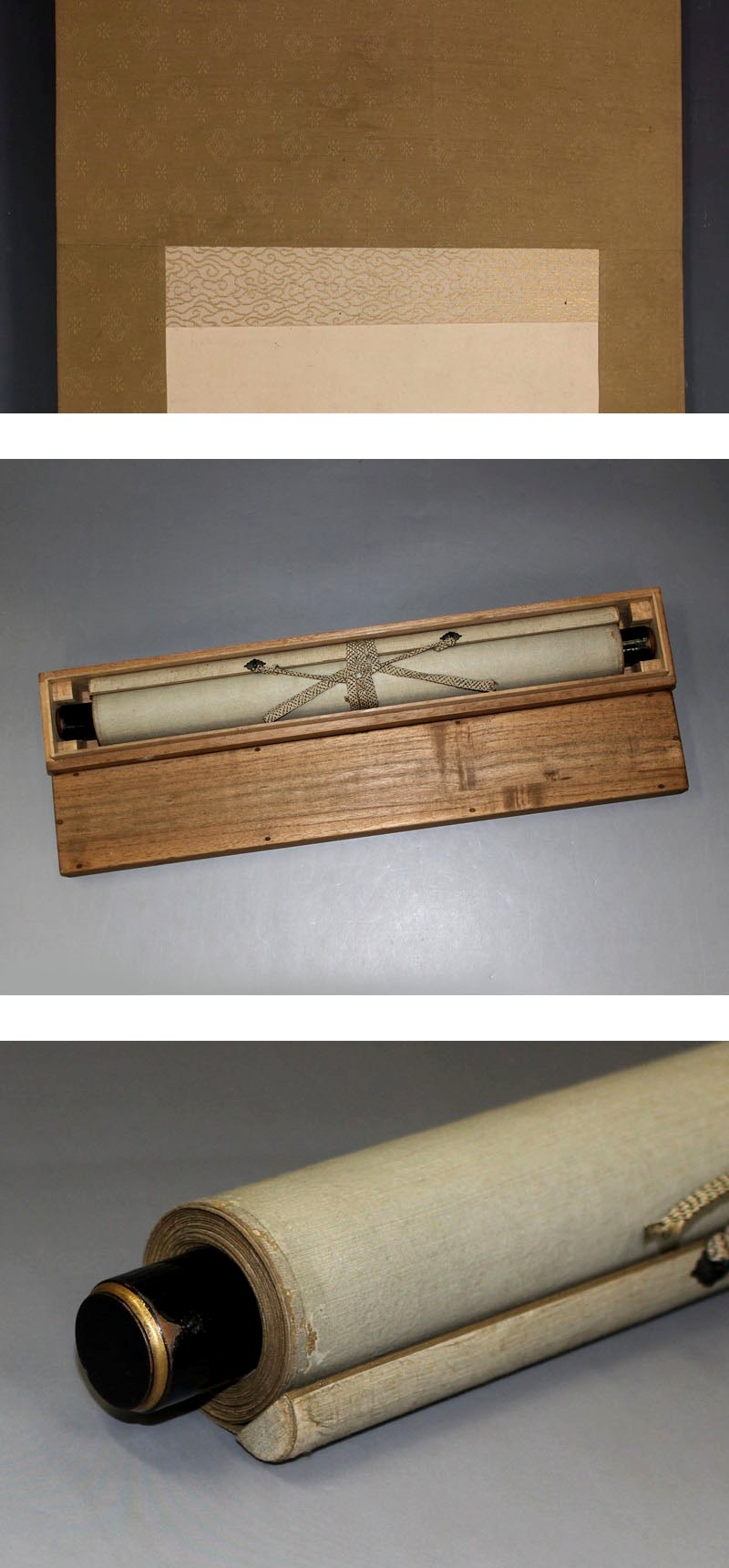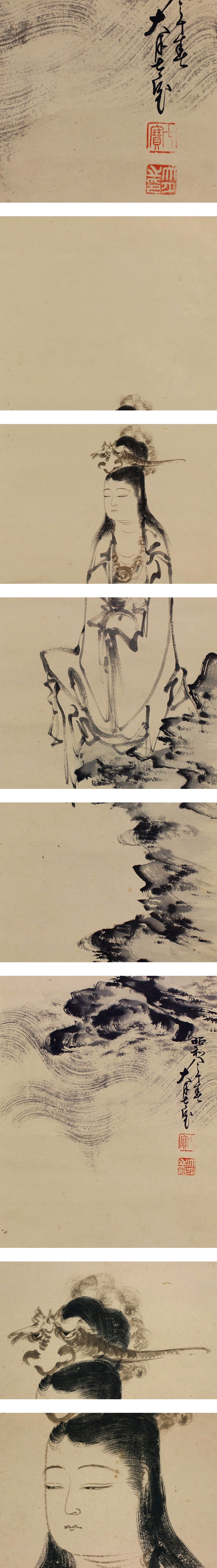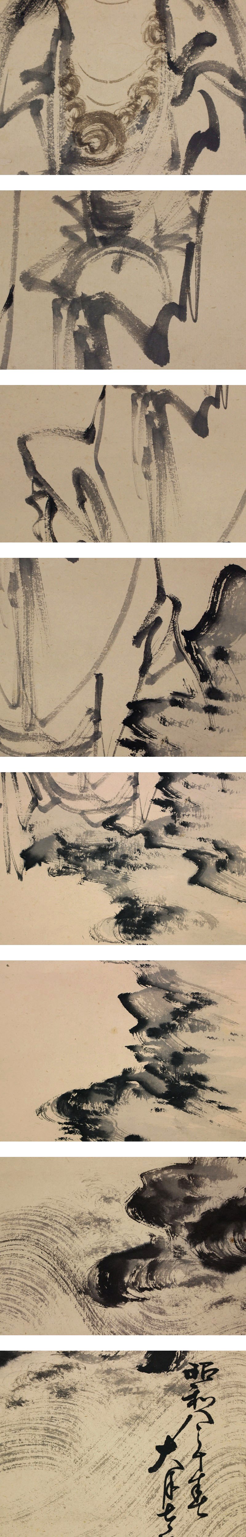 大月七宝 【岩上観音】 本紙は、染み、汚れ、折れ、皺、軽い擦れがあります。 表装は、染み、汚れ、くすみ、軽い折れ、皺、虫食、破れ、軸先に擦れ傷があります。 【サイズ】 作品 横約27.5cm×縦約127cm 表装 横約39.5cm×縦約193.5cm |