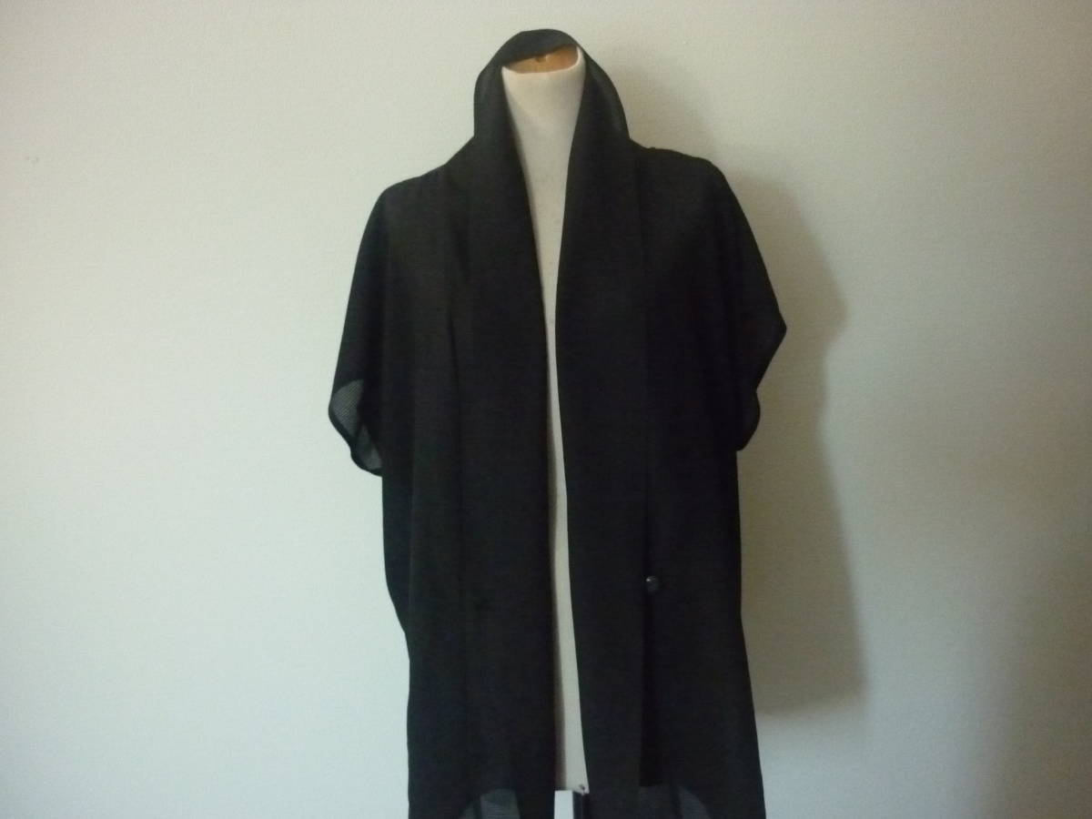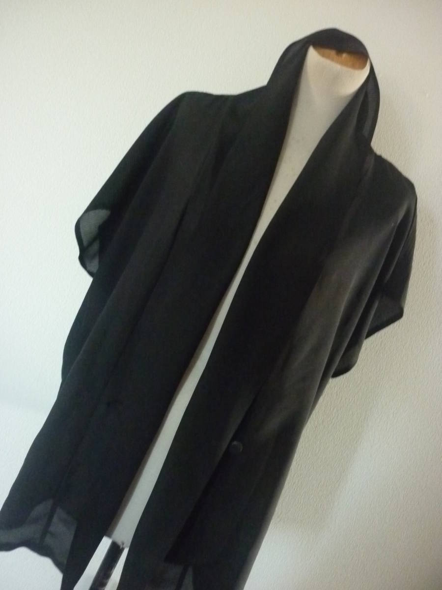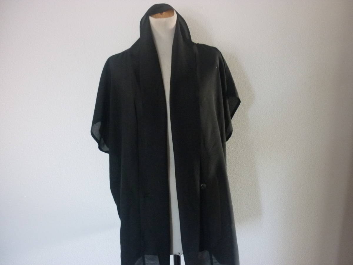 4L程度の方までご着用頂けます、透け感のある、黒絽の着物を解いて、ロングベストに、着物リメイク致しました。実寸は脇下身幅63、総丈68程度になります。クルミボタンを1つ付けました。