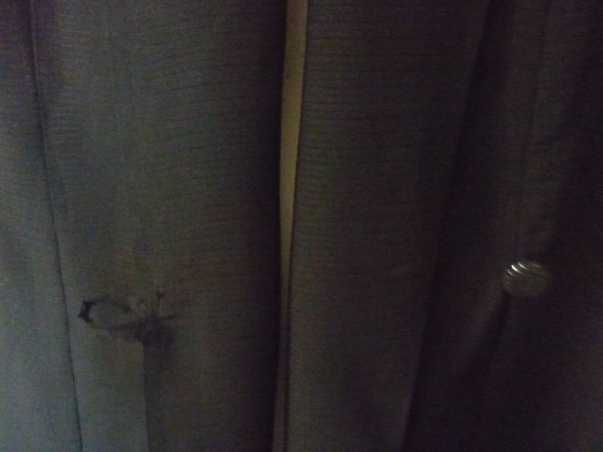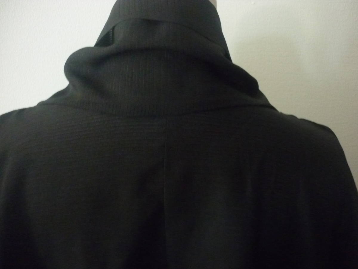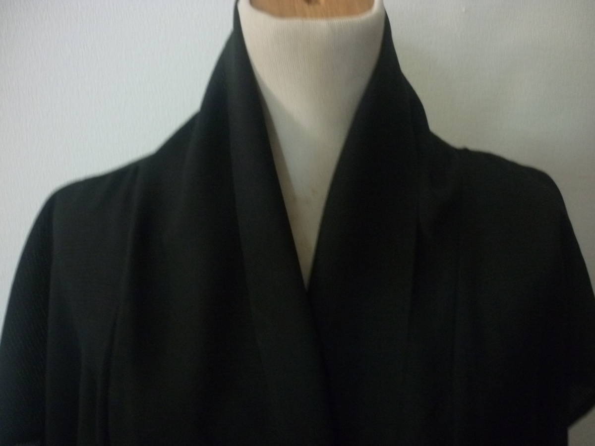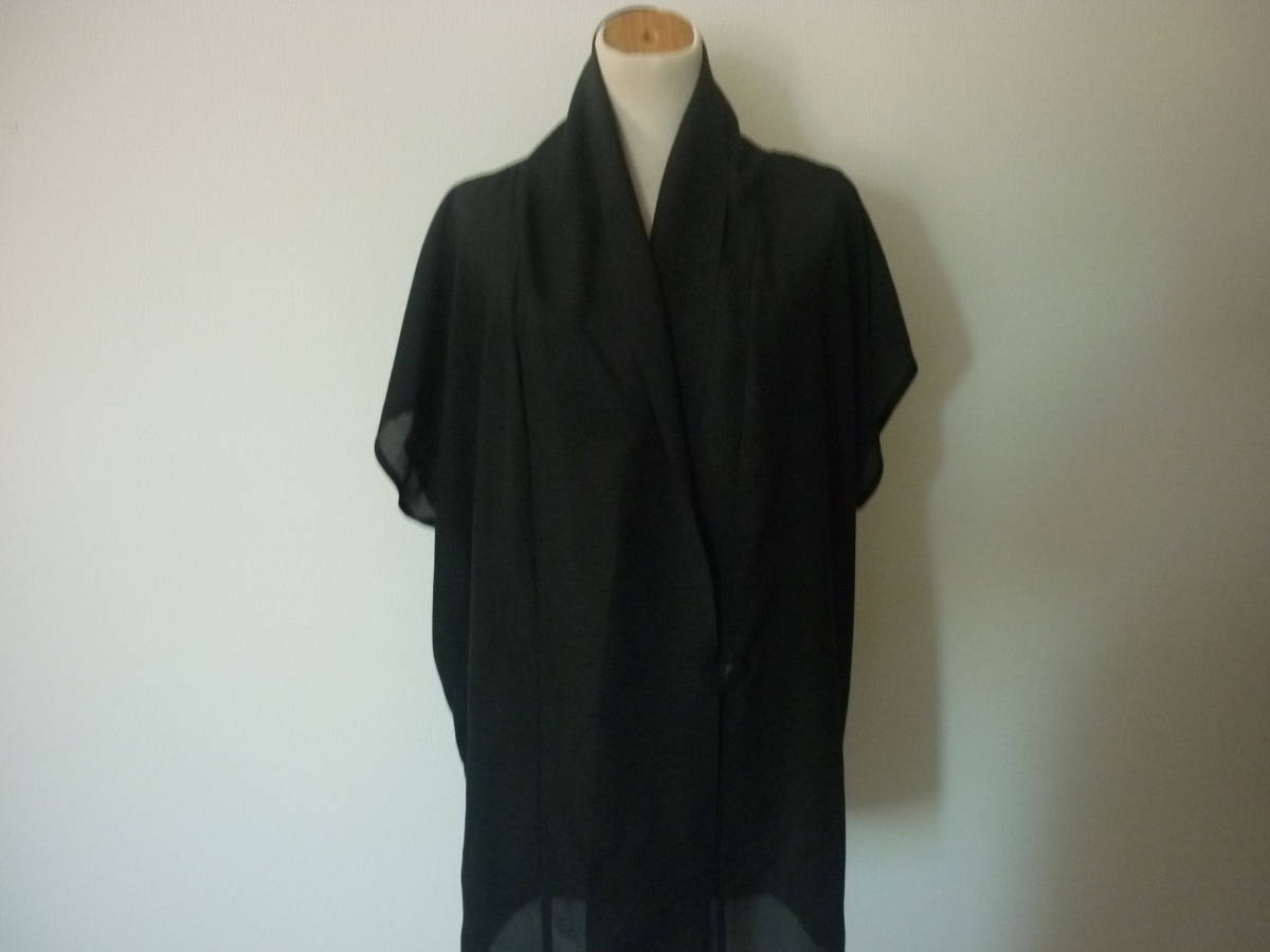 4L程度の方までご着用頂けます、透け感のある、黒絽の着物を解いて、ロングベストに、着物リメイク致しました。実寸は脇下身幅63、総丈68程度になります。クルミボタンを1つ付けました。