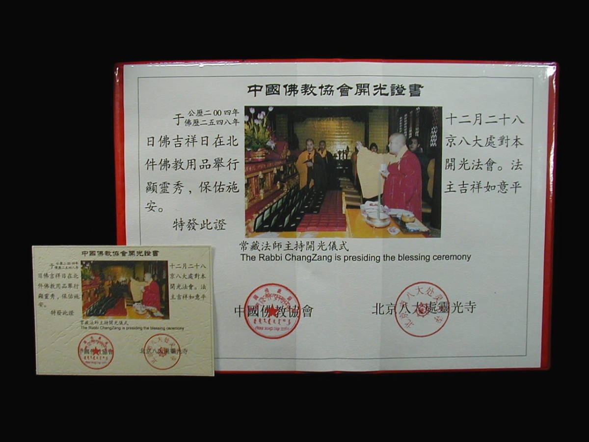 最後の7、8枚のの写真をご覧ください。本品にお付けする開光証書は、中国佛教協会と北京八大処霊光寺により発行されたものです。写真右側の大きい開光証書は、正式の原本です。(1,600件の開光品に対してたった一つの証書が発行されたのみです。小さい正式開光証書は、中国佛教協会と北京八大処霊光寺により発行された本品のための正式開光証書です。)