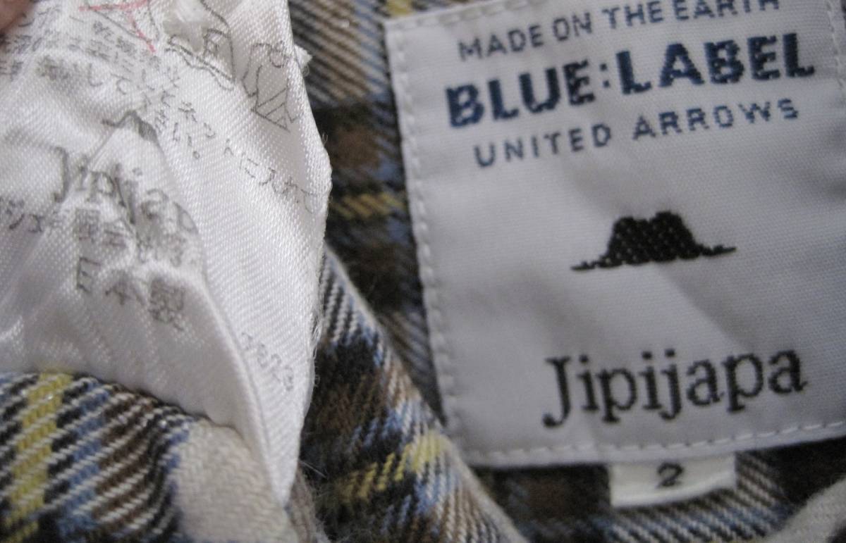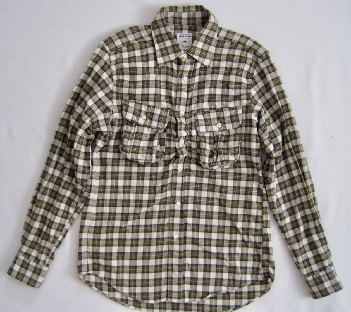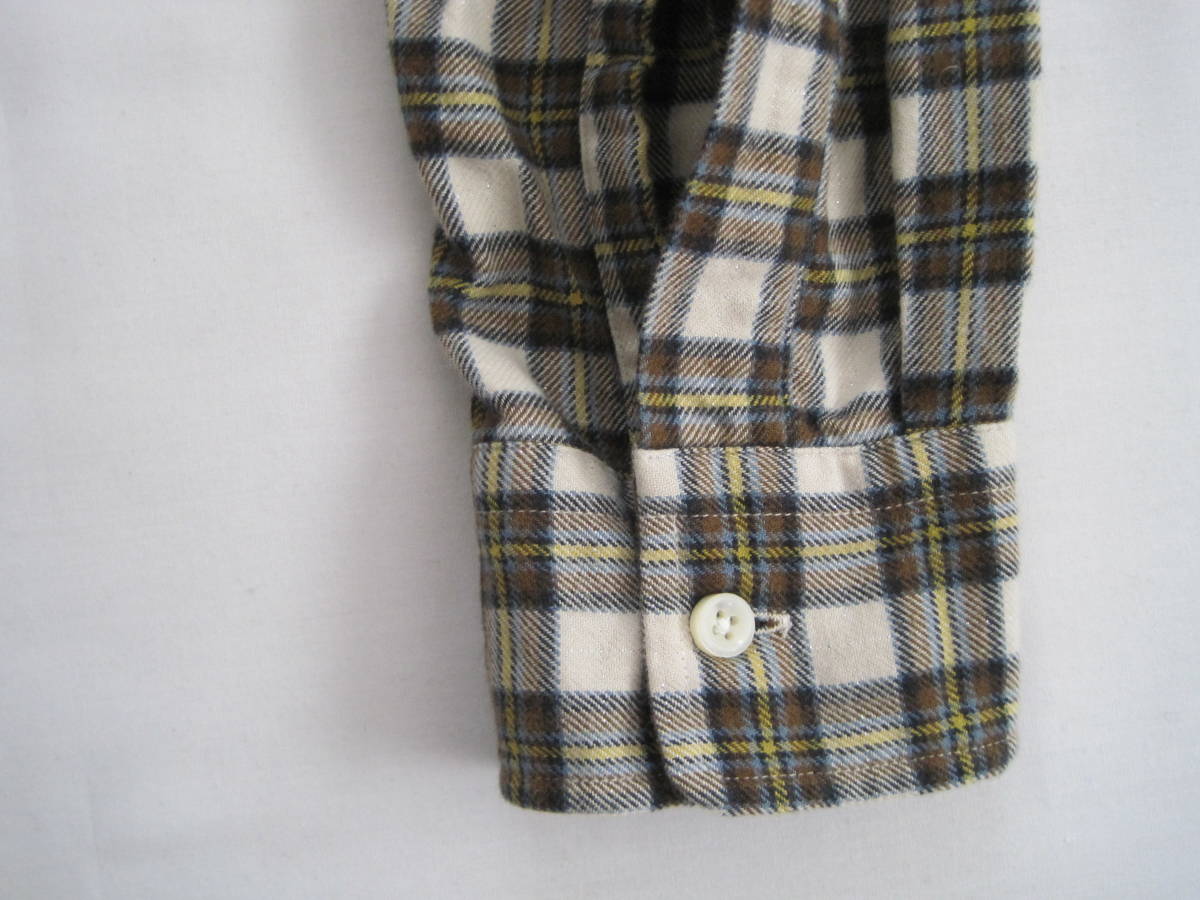 ブルーレーベル×ヒピハパ フランネルチェックシャツ。フロントボタン部分がギャザーになっています。サイズ2。