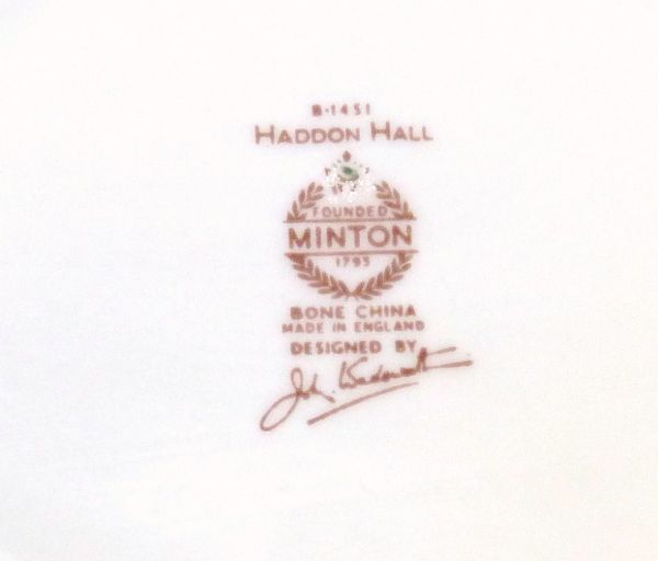 | ブランド | ミントン(Minton)は、かつて存在したイギリスの陶磁器メーカー。銅版転写の彫刻師だったトーマス・ミントンによって1793年に創業された。2代目ハーバート・ミントンによって生産性・芸術性を高め、大きく飛躍する。ミントンは豪華に金彩を施した食器を数々生み出し、世界で最も美しいボーンチャイナと呼ばれ、1840年ヴィクトリア女王より賞賛される。1856年から王室御用達となる。戦後になるとミントンは、金彩を施したシリーズから一変し、1948年、デザイナーのジョン・ワズワースがハドンホール城の壁に掛けられていたタペストリーのモチーフをデザインした「ハドンホール」を発表し、ミントンの永遠の定番品として、その名を世界に知らしめることとなる。また、「ハドンホール」と同時期にデザインされつつも、採用とならなかった「ハドンホールブルー」が1993年に発表され、以後「ハドンホール」と並ぶベストセラーとなる。2015年、親会社ロイヤルドルトンが買収されWWRDグループホールディングスの一員となり、ミントンブランドは廃止された。 |