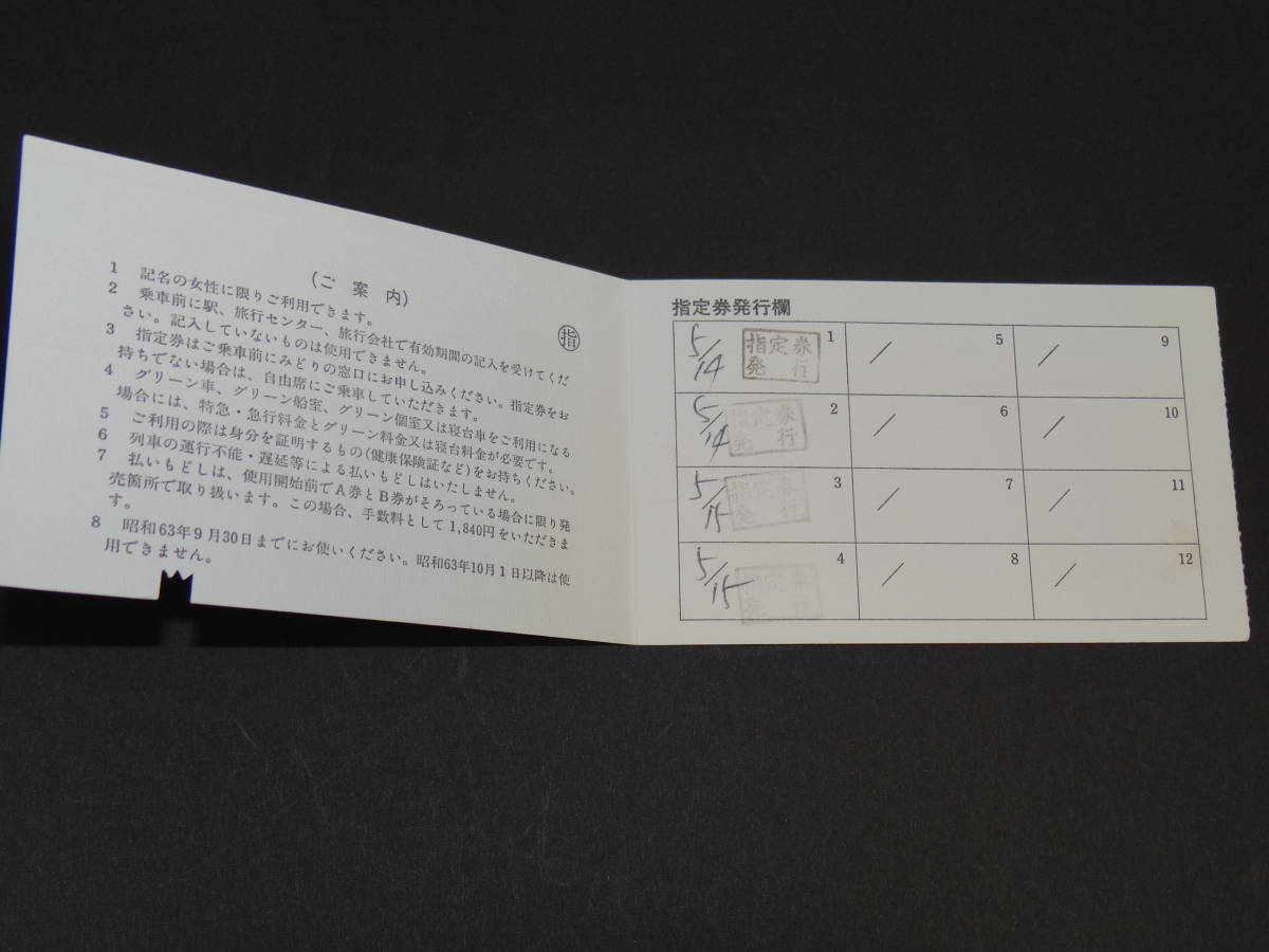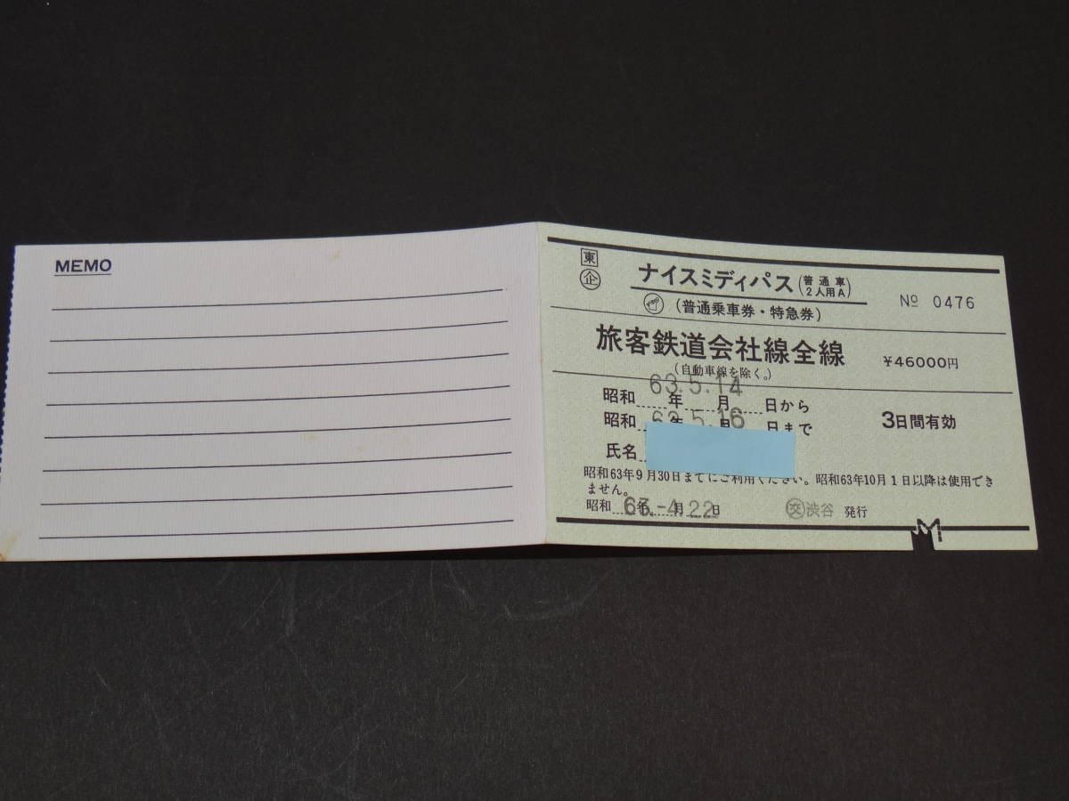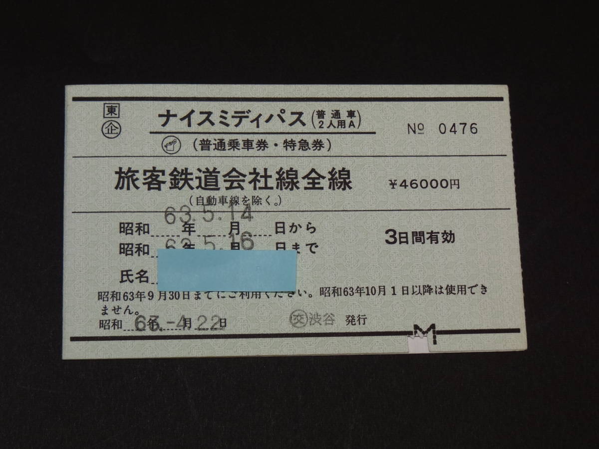 【JR東日本】ナイスミディーパス(普通車2人用A)手売り券 S63 JR地紋 パンチ有