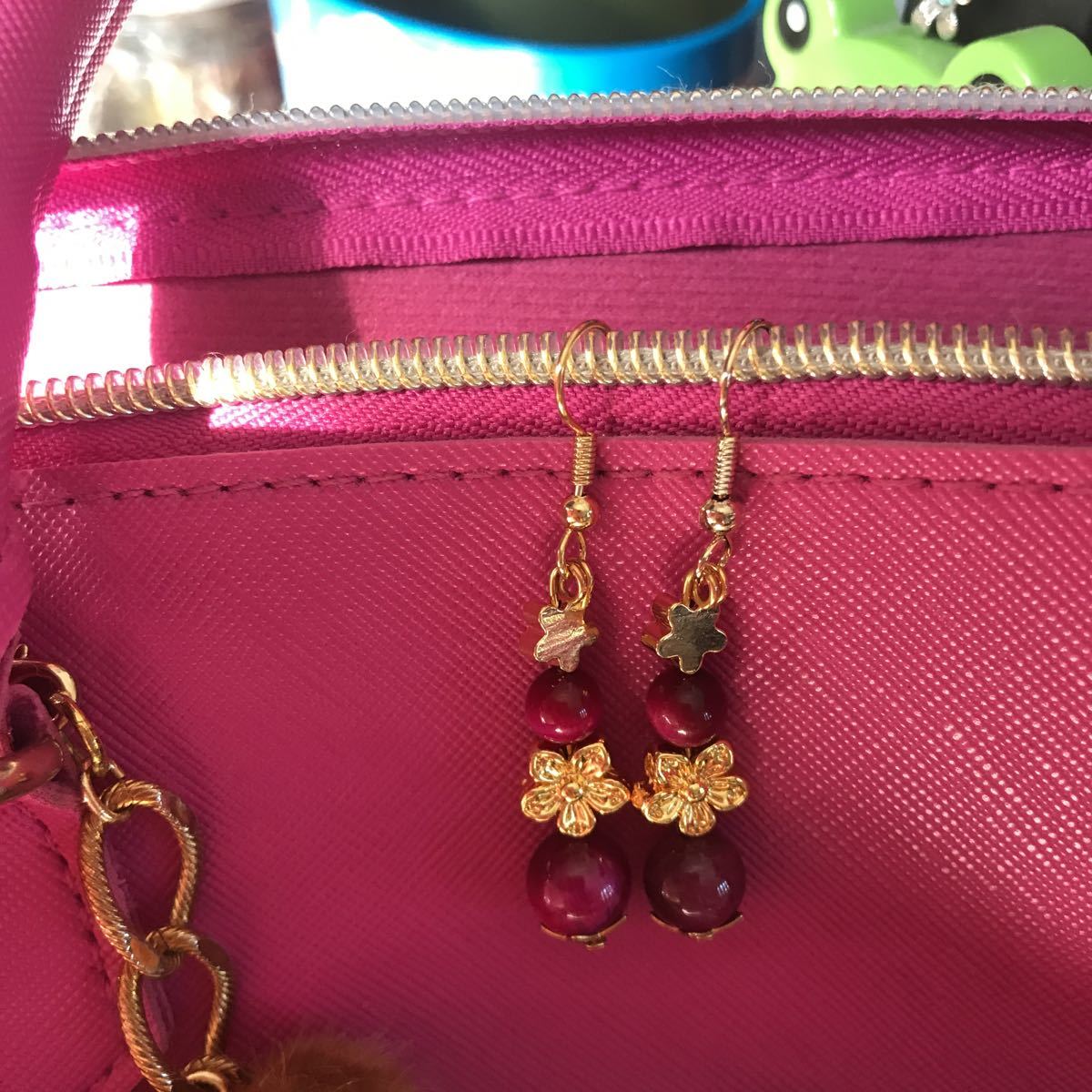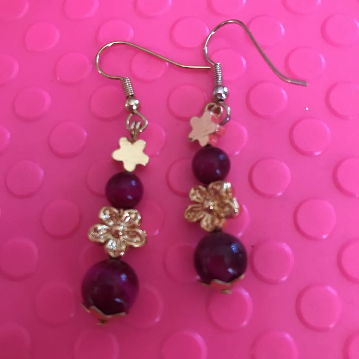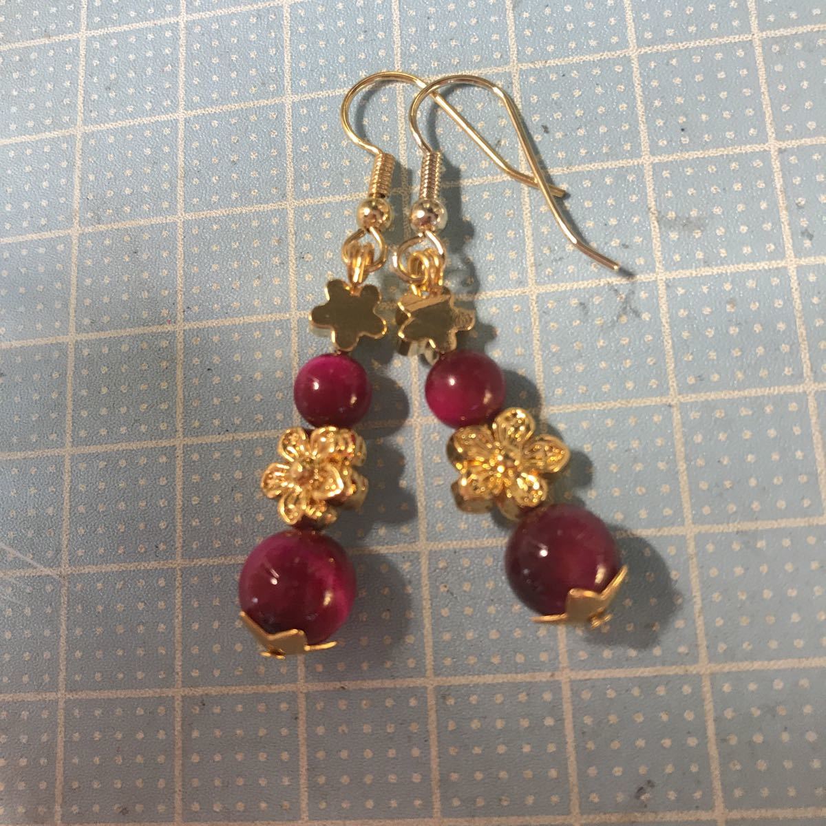 変色しない真鍮のゴールドの桜にタイガーアイ8ミリ6ミリを合わせました。フックはサージカルステンレス使用しております。