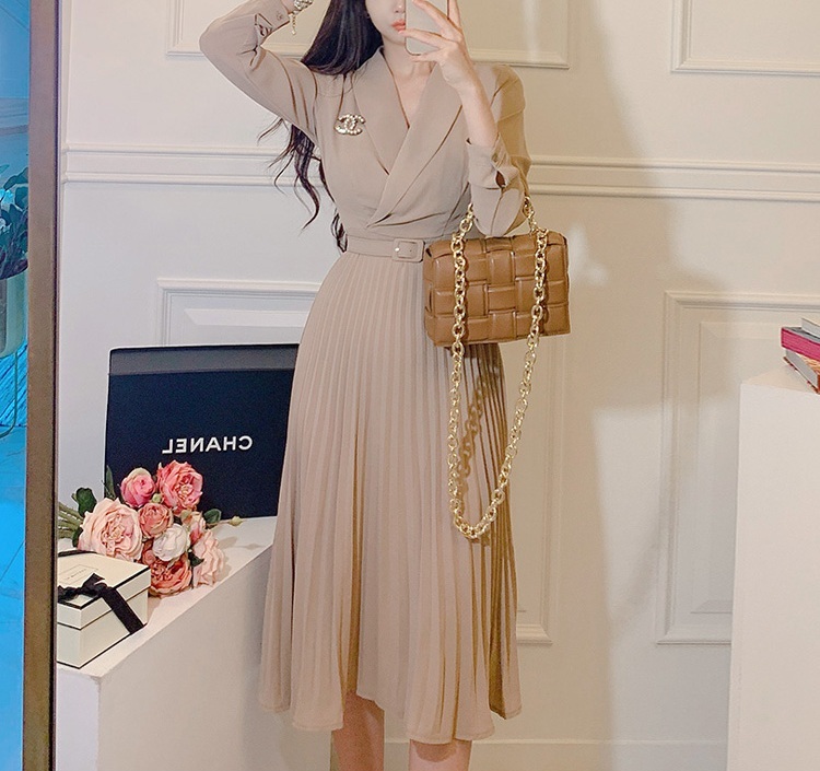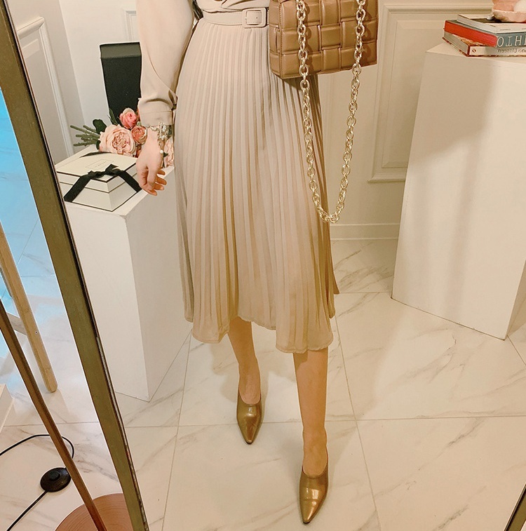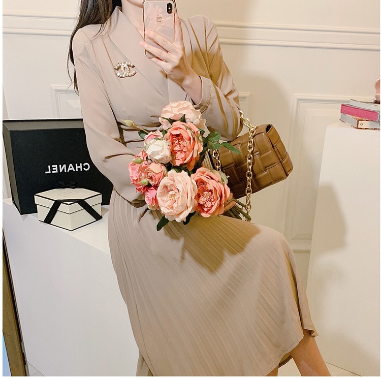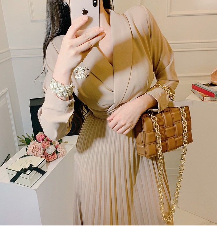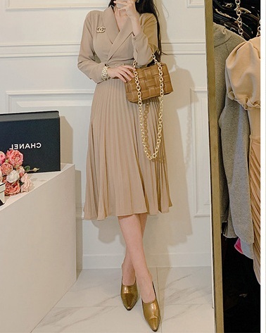 レディースショール襟クロス長袖ワンピースプリーツスカートベージュL