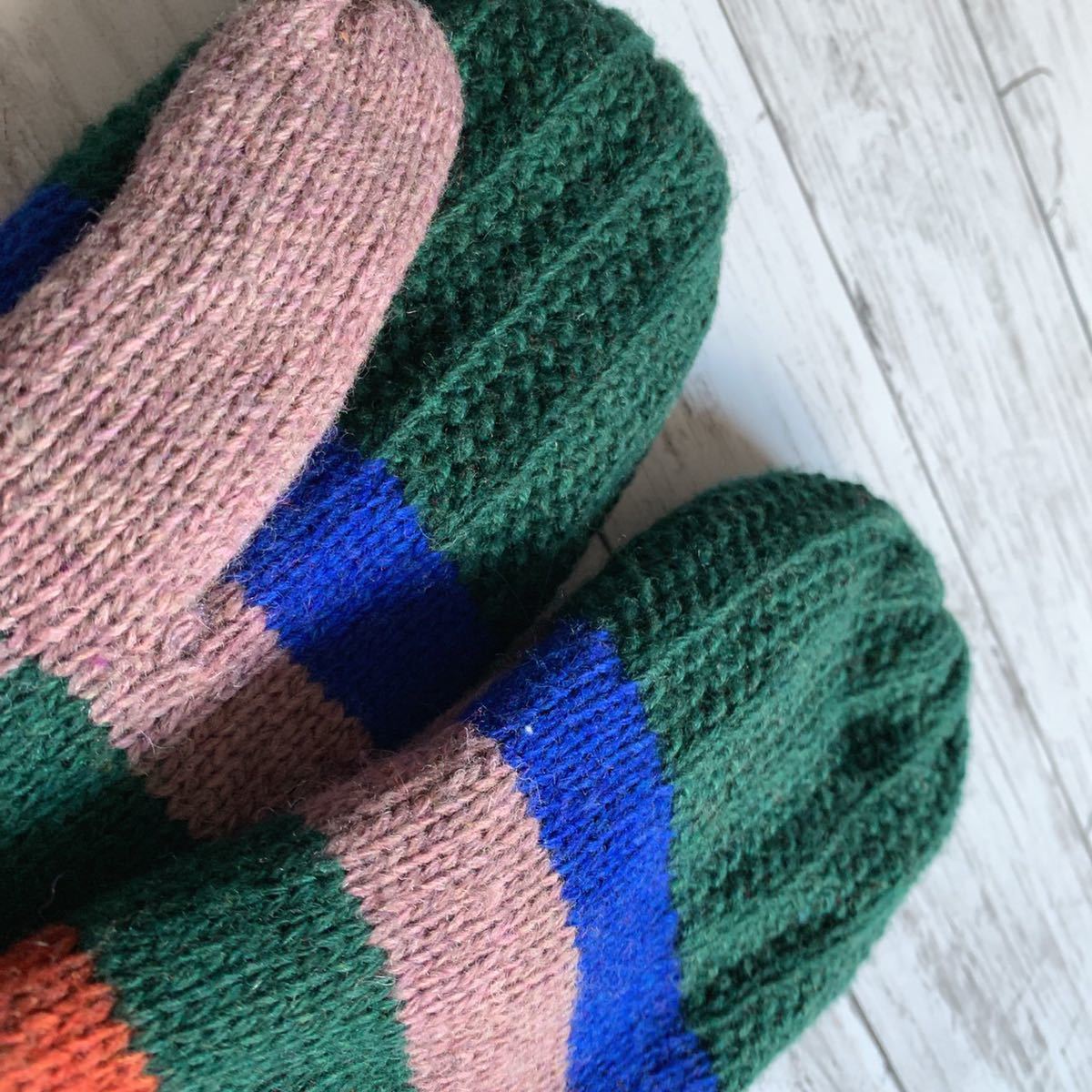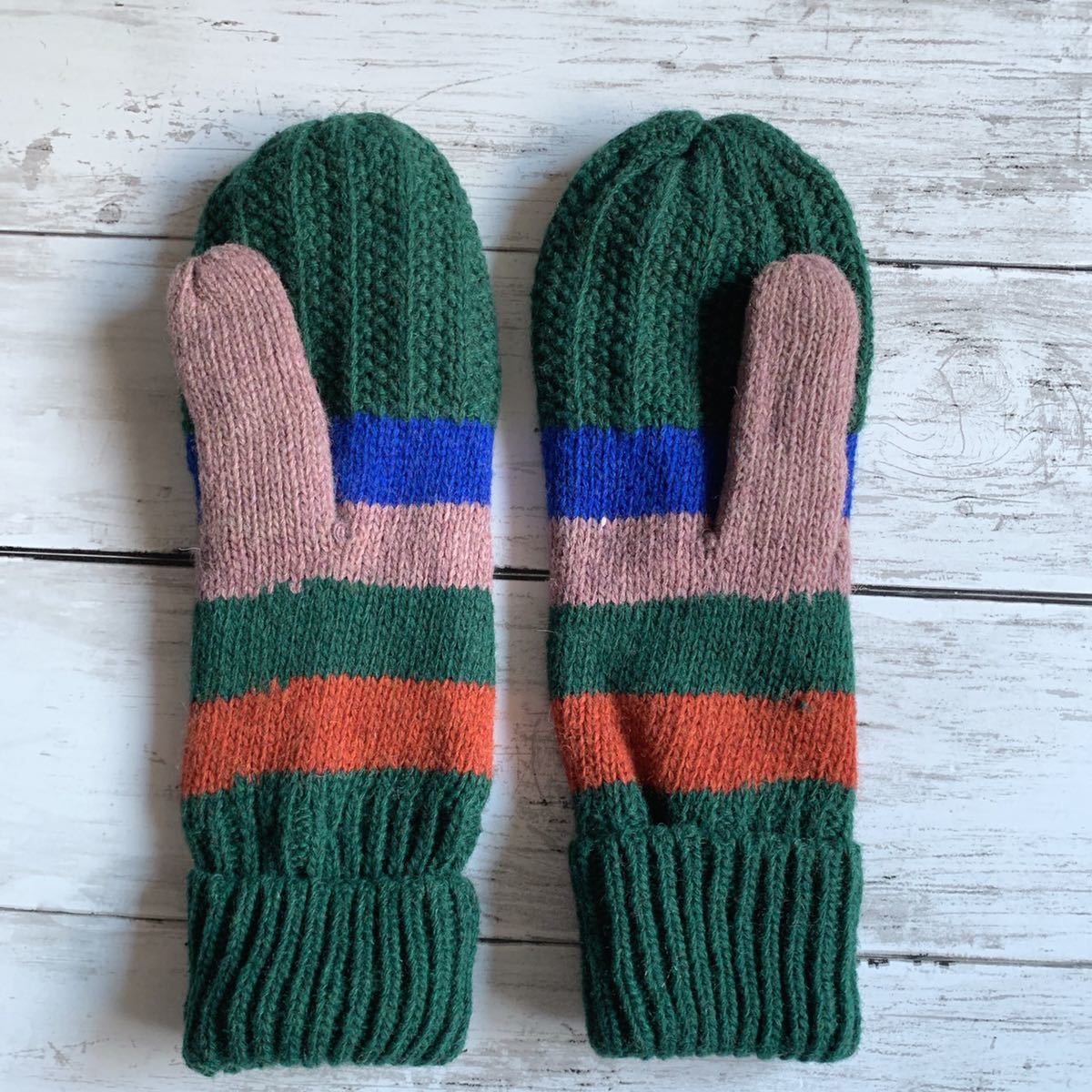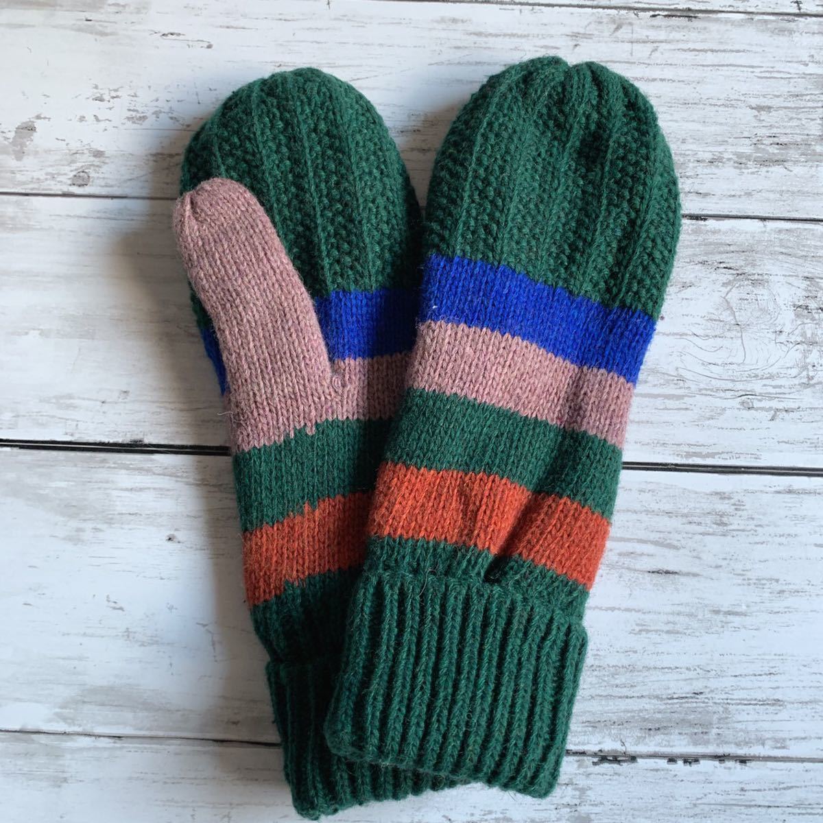 【新品未使用】マルチボーダー柄ミトン 手袋 ハンドウォーマー ウール×アクリル 26cm×7cm 緑 ST_A③